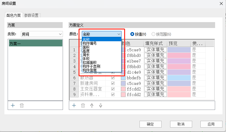 - 颜色方案支持按值和按范围进行设置,属性值数据类型为数值的,可按值或按范围设置方案,如房间的面积、体积、高度等;任意属性值数据类型,均可按值设置方案,如:房间名称、房间编号、面积等;