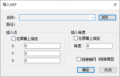- <插入点>:可以通过输入绝对坐标值X、Y、Z来指定SKP格式模型在屏幕上的指定位置,也可以选择在屏幕上指定,通过鼠标点击的方式确定位置。