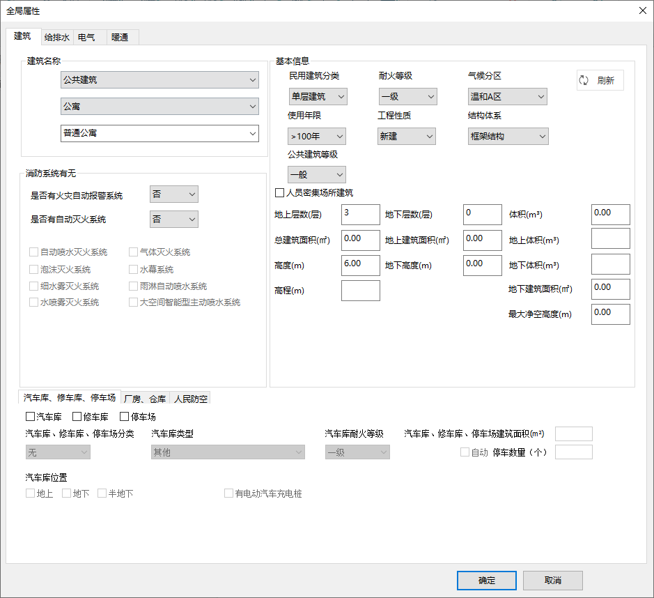 - <基本信息>:选择建筑的基本属性,如民用建筑分类、耐火等级、建筑所在气候分区、使用年限、工程性质、结构体系、公共建筑等级等