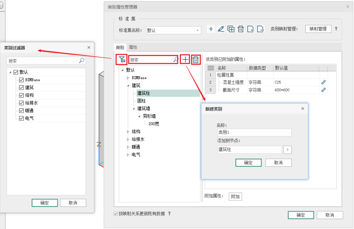 类别菜单 - 在类别菜单下,可以通过类别过滤器控制类别树中需要显隐的类别对象;还可通过搜索框输入关键字模糊搜索指定内容,还可以点击新建工具,输入类别名称新建标准类别,在类别树中层级不做限制;通过删除工具,可以删除选定对象;如图