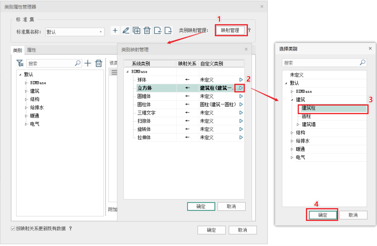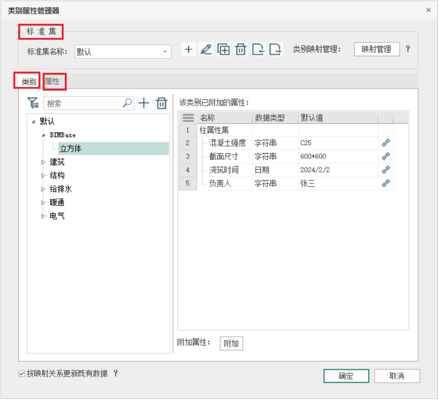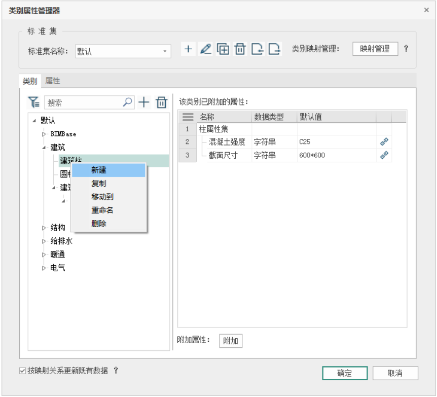 其他说明 - 按映射关系更新既有数据选项,在没有勾选时,对构件类别为未定义的实例构件不会同步更新数据;但新建构件会按映射关系自动挂载类别属性信息;当勾选按映射关系更新既有数据选项时,没有挂载标准类别的实例构件会同步更新数据;如图