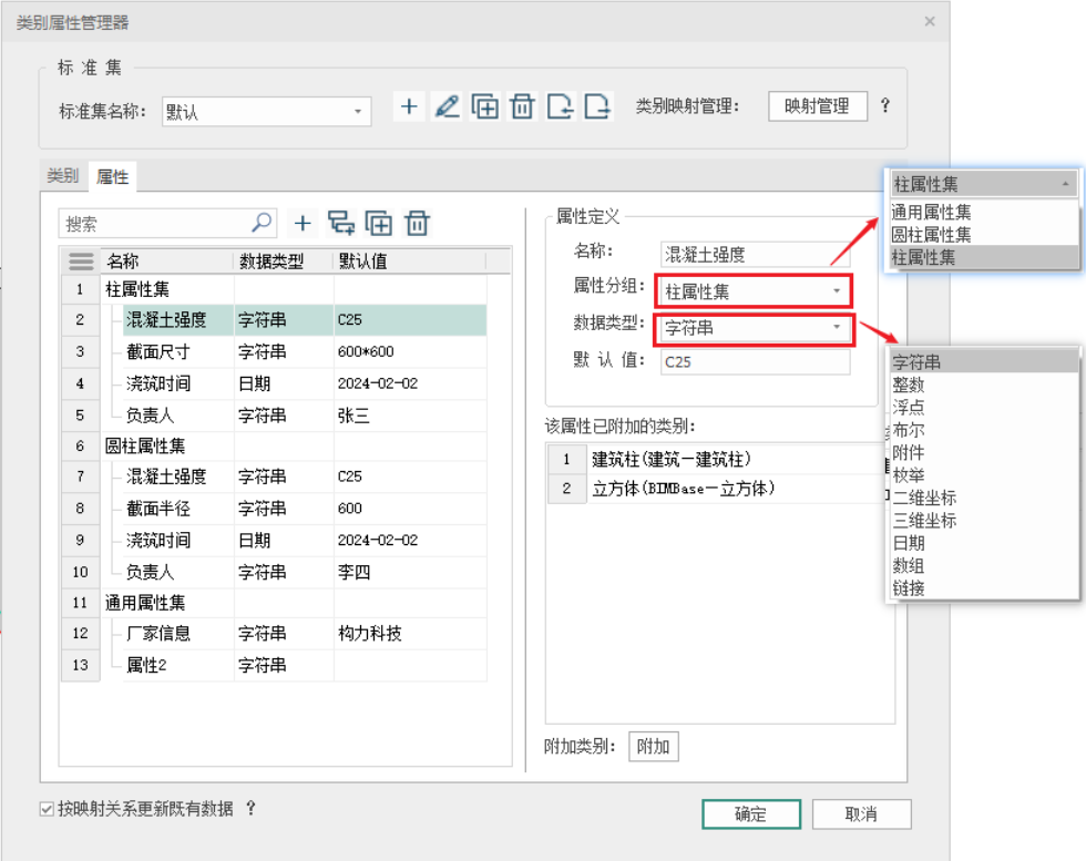 - 另外,选择任意属性集或属性,可以对其名称、属性分组、数据类型、默认值进行编辑交互,目前数据类型包含11种常用类型,包含“字符串”、“整数”、“浮点”、“布尔”、“附件”、“枚举”、“二维坐标”、“三维坐标”、“日期”、“数组”和“链接”等,如图