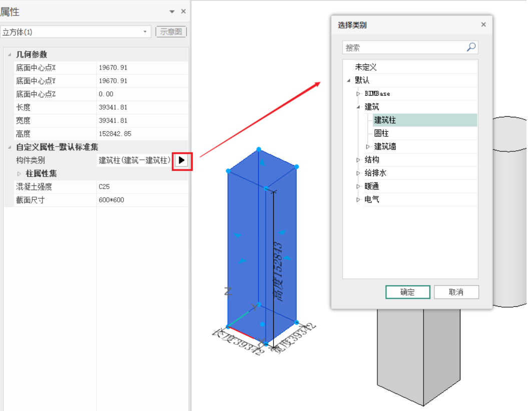 - 实例构件也支持手动编辑修改构件类别,通过点击编辑按钮,可以在选择类别对话框中指定标准类别,点击确定按钮即可挂载成功,同时扩展属性也会同步更新,且扩展属性也支持手动编辑修改属性值;如图