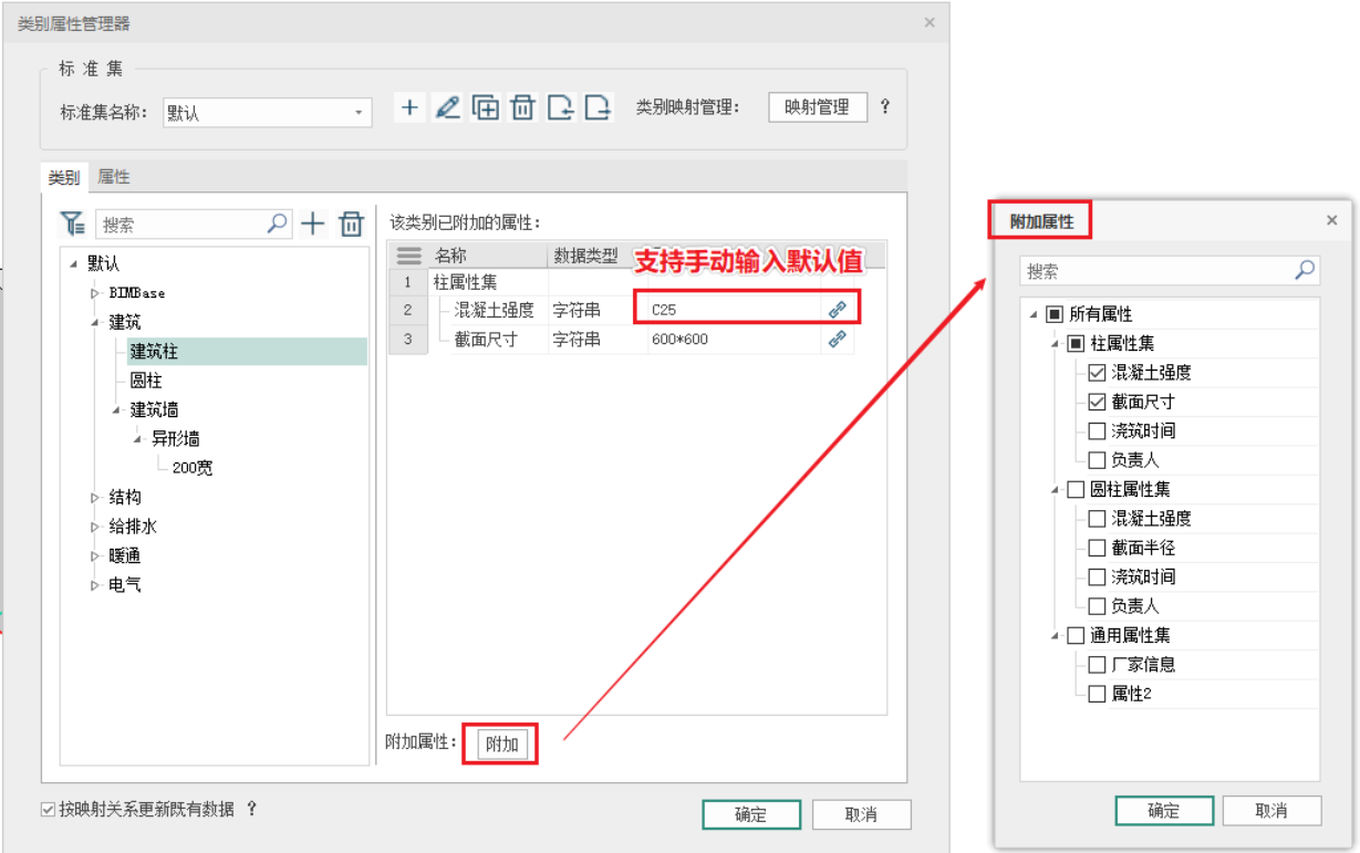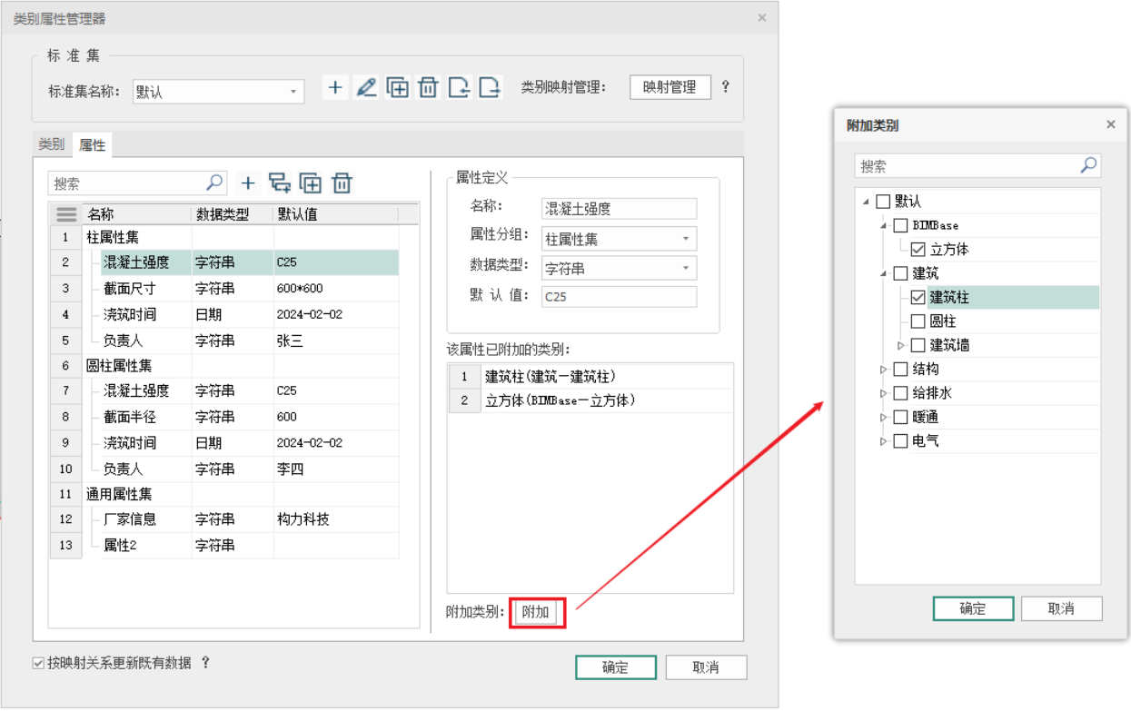 - 选择任意对象,可以通过附加工具,未该对象附加属性信息,在弹出对话框中,勾选指定属性对象,点击确定即可附加到类别对象上;已经附加的属性,支持手动编辑属性默认值,还可以通过点击关联按钮,恢复初始默认值;如图
