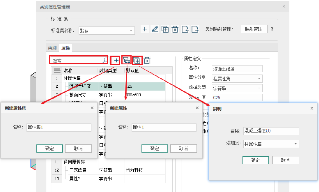 属性菜单 - 在属性菜单下,可以通过搜索框输入关键字模糊搜索指定内容,也可以点击新建属性集工具,输入属性集名称新建属性集,还可以点击新建属性工具,输入属性名称新建自定义属性,同时,可以通过删除工具删除选定对象,如图