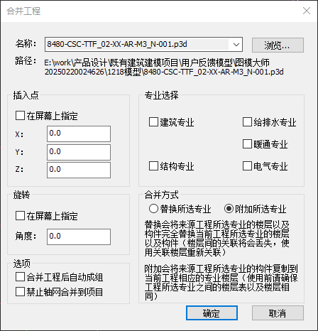 附加所选专业会将源工程所选专业的构件附加到当前工程相应的专业楼层,使用该功能需要确保合并源文件与当前项目专业之间的楼层表及楼层相同。<插入点>:勾选【在屏幕上指定】,可以鼠标点选确定合并基点,取消勾选可在界面输入合并点的xyz坐标;