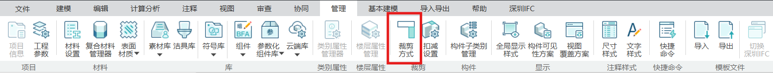 可在【管理】中选择【裁剪方式】,在建模前对各类墙体进行裁剪设置,如图: