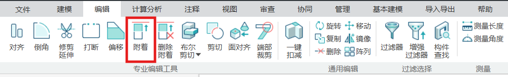 在编辑菜单栏中选择删除附着工具,选择已吸附的墙,右键确认,即可完成墙体的删除附着,如图5
