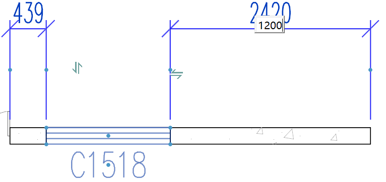 二维和三维显示下,选中布置后的窗,出现临时尺寸线,单击尺寸数值,输入数值并回车,可对窗距离进行位置修改,如图6所示:
