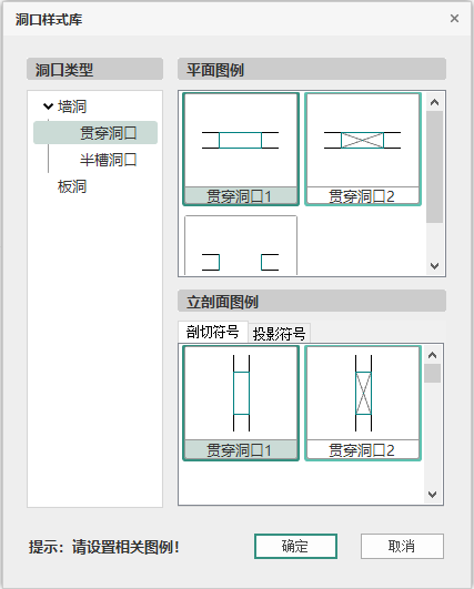 - 【符号化表达】:单击洞口样式库,弹出对话框,预设不同洞口的二维表达图例,设置成功后绘制的洞口将自动匹配相应的二维表达样式;