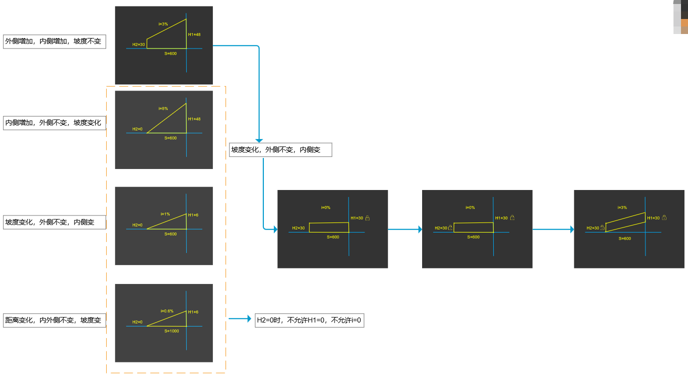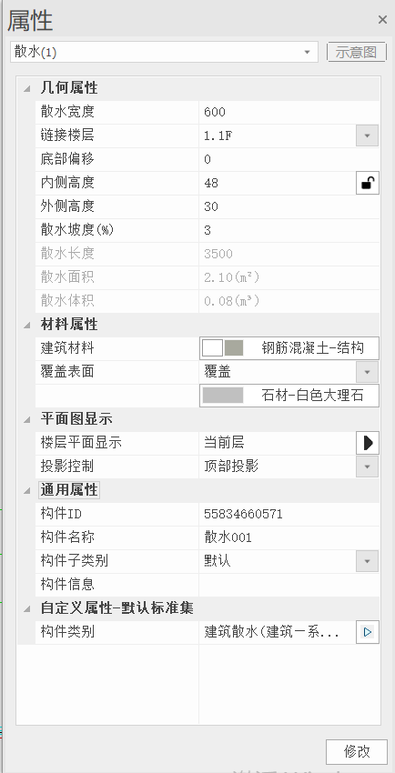 目录 搜索 展开 首页乘车路线版权与商标说明免责声明更新说明20242024R1.02024R1.12024R1.22024R1.32024R1.42024R2.02024R2.12024R2.220232023R1.020222022R3.12022R3.02022R2.12022R2.02022R1.42022R1.32022R1.22022R1.020252025R1.1工作环境最低运行环境启动界面用户操作界面快速访问工具栏视图盒子模型操作视图区命令提示行项目浏览器属性面板多窗口显示设置视图工具条光照亮度三维坐标捕捉设置通用操作文件(平台)功能键临时辅助线抬头工具栏追踪器自定义工具条临时尺寸线参考线、夹点弹出式小面板右键菜单专业建模标高标高绘制楼层管理复制构件局部复制删除构件轴网定位正交轴网轴线绘制识别联动命名排序专业构件墙创建墙编辑墙梁创建梁编辑梁板创建板编辑板柱创建柱编辑柱屋顶创建屋顶编辑屋顶幕墙创建幕墙编辑幕墙门创建门编辑门窗创建窗编辑窗自定义门窗自定义门窗预设自定义飘窗、转角窗框板编辑嵌板编辑自定义门窗的调用与管理自定义门窗导出/导入洞口创建洞口编辑洞口楼梯创建楼梯环境外编辑楼梯环境内编辑楼梯台阶创建台阶编辑台阶坡道创建坡道编辑坡道栏杆扶手创建栏杆编辑栏杆复杂截面管理器栏杆样式散水创建散水编辑散水房间布置房间配置房间分隔区域划分房间设置面层面层面层分格线场地创建场地编辑场地用地控制线创建用地控制线编辑用地控制线三维文字辅助工具识别图纸创建工作平面工作平面管理器基本建模编辑工具专业编辑工具对齐修剪延伸附着布尔剪切剪切面对齐打断端部裁剪倒角裁剪刷新偏移删除附着通用编辑移动镜像删除阵列复制旋转过滤选择过滤器增强过滤器测量长度测量角度测量面积测量标高测量坐标测量组合组合解组开始组暂停组编辑组块块定义块分解块编辑块管理拾取刷新拾取属性刷新属性计算分析计算分析内外墙判定指标分析重叠处理内外墙判定结果注释二维工具线型二维工具填充通用标注逐点标注直径标注半径标注弧长标注角度标注标高标注引出标注箭头引注索引标注多层标注折断线变更云线三维标高标注自动标注通用文字单行文字多行文字文字识别通用表格插入表格&表格编辑视图视图创建3D剖切工具局部剖切创建立面创建剖面门窗大样图纸生成图纸导出图纸清单统计清单生成清单样式清单单位清单结果审查审查流程设置全局属性楼层信息模型自检审查智能审查审查结果数据导出审查报告导出构件查找CIM平台基点设置导出广州汇交格式审查IFC深圳IFC基点设置选择标准建筑赋值空间赋值构件赋值规则配置导出SZ-IFC上海IFC选择标准基点设置楼层设置导出SH-IFC协同链接模型链接P3D链接管理碰撞检查碰撞检查碰撞结果碰撞报告净高分析净高设置净高平面净高检查净高刷新建筑开洞提资云协同合并/拆分工程合并工程批量合并拆分工程管理项目项目信息工程参数材料材料设置复合材料管理器表面材质库素材库二三维构件的导入、导出二维图块导入、导出三维图块编辑、删除二维图块编辑、删除属性修改三维构件二维构件素材修复/精度设置洁具库界面洁具的布置属性修改/更新洁具符号库组件创建bfa组件属性管理参数驱动平面工具实体工具造型工具扫掠体旋转体拉伸体融合体多界面融合截面集布尔运算交集并集差集辅助建模工作平面创建工作平面工作平面管理编辑操作说明临时坐标系组件编辑可见性材质库云端库参数化组件库(平台)类别管理类别属性管理器(平台)楼层属性楼层属性管理器裁剪裁剪方式扣减设置构件子类别构件子类别管理显示全局显示样式构件可见性方案视图覆盖方案注释样式尺寸样式文字样式快捷命令导入导出参照底图导入底图管理参照匹配导入导出导出PMODEL导入PMODEL导出IFC导入IFC导出FBX导入3ds导入SKP导入STEP对接品茗导出图片外部数据控制晨曦深化构件筛选晨曦钢筋显隐晨曦钢筋删除绿色低碳导入BDLS导出BDLS**文字示意**二级文字示意格式模板 暂无相关搜索结果! 编辑散水 使用说明操作说明 点击已布置散水; 可在属性栏中对散水的【宽度】、【内外侧高度】以及【坡度】进行修改。 鼠标移动到目标位置进行编辑操作,左键点击完成操作。图1 散水属性对话框 散水内外侧高度和坡度之间的变化关系如图图2 散水内外侧高度和坡度之间的变化关系图 夹点编辑点击散水,可实现随意拖拽移动此夹点,改变散水的路径、长度,如图2所示。图3 夹点编辑