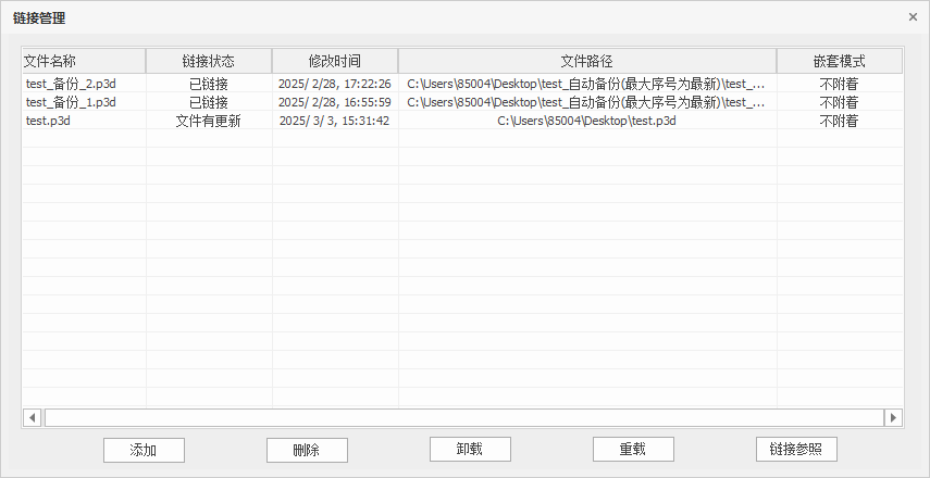 - <重载>:将已卸载链接模型重新加载,加载后模型链接状态为已加载。当链接文件有更新时,链接状态会提示“文件有更新”,此时点击【重载】可重新载入更新后的链接模型;