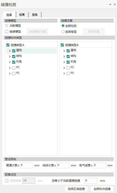 目录 搜索 展开 首页乘车路线版权与商标说明免责声明更新说明20242024R1.02024R1.12024R1.22024R1.32024R1.42024R2.02024R2.12024R2.220232023R1.020222022R3.12022R3.02022R2.12022R2.02022R1.42022R1.32022R1.22022R1.020252025R1.1工作环境最低运行环境启动界面用户操作界面快速访问工具栏视图盒子模型操作视图区命令提示行项目浏览器属性面板多窗口显示设置视图工具条光照亮度三维坐标捕捉设置通用操作文件(平台)功能键临时辅助线抬头工具栏追踪器自定义工具条临时尺寸线参考线、夹点弹出式小面板右键菜单专业建模标高标高绘制楼层管理复制构件局部复制删除构件轴网定位正交轴网轴线绘制识别联动命名排序专业构件墙创建墙编辑墙梁创建梁编辑梁板创建板编辑板柱创建柱编辑柱屋顶创建屋顶编辑屋顶幕墙创建幕墙编辑幕墙门创建门编辑门窗创建窗编辑窗自定义门窗自定义门窗预设自定义飘窗、转角窗框板编辑嵌板编辑自定义门窗的调用与管理自定义门窗导出/导入洞口创建洞口编辑洞口楼梯创建楼梯环境外编辑楼梯环境内编辑楼梯台阶创建台阶编辑台阶坡道创建坡道编辑坡道栏杆扶手创建栏杆编辑栏杆复杂截面管理器栏杆样式散水创建散水编辑散水房间布置房间配置房间分隔区域划分房间设置面层面层面层分格线场地创建场地编辑场地用地控制线创建用地控制线编辑用地控制线三维文字辅助工具识别图纸创建工作平面工作平面管理器基本建模编辑工具专业编辑工具对齐修剪延伸附着布尔剪切剪切面对齐打断端部裁剪倒角裁剪刷新偏移删除附着通用编辑移动镜像删除阵列复制旋转过滤选择过滤器增强过滤器测量长度测量角度测量面积测量标高测量坐标测量组合组合解组开始组暂停组编辑组块块定义块分解块编辑块管理拾取刷新拾取属性刷新属性计算分析计算分析内外墙判定指标分析重叠处理内外墙判定结果注释二维工具线型二维工具填充通用标注逐点标注直径标注半径标注弧长标注角度标注标高标注引出标注箭头引注索引标注多层标注折断线变更云线三维标高标注自动标注通用文字单行文字多行文字文字识别通用表格插入表格&表格编辑视图视图创建3D剖切工具局部剖切创建立面创建剖面门窗大样图纸生成图纸导出图纸清单统计清单生成清单样式清单单位清单结果审查审查流程设置全局属性楼层信息模型自检审查智能审查审查结果数据导出审查报告导出构件查找CIM平台基点设置导出广州汇交格式审查IFC深圳IFC基点设置选择标准建筑赋值空间赋值构件赋值规则配置导出SZ-IFC上海IFC选择标准基点设置楼层设置导出SH-IFC协同链接模型链接P3D链接管理碰撞检查碰撞检查碰撞结果碰撞报告净高分析净高设置净高平面净高检查净高刷新建筑开洞提资云协同合并/拆分工程合并工程批量合并拆分工程管理项目项目信息工程参数材料材料设置复合材料管理器表面材质库素材库二三维构件的导入、导出二维图块导入、导出三维图块编辑、删除二维图块编辑、删除属性修改三维构件二维构件素材修复/精度设置洁具库界面洁具的布置属性修改/更新洁具符号库组件创建bfa组件属性管理参数驱动平面工具实体工具造型工具扫掠体旋转体拉伸体融合体多界面融合截面集布尔运算交集并集差集辅助建模工作平面创建工作平面工作平面管理编辑操作说明临时坐标系组件编辑可见性材质库云端库参数化组件库(平台)类别管理类别属性管理器(平台)楼层属性楼层属性管理器裁剪裁剪方式扣减设置构件子类别构件子类别管理显示全局显示样式构件可见性方案视图覆盖方案注释样式尺寸样式文字样式快捷命令导入导出参照底图导入底图管理参照匹配导入导出导出PMODEL导入PMODEL导出IFC导入IFC导出FBX导入3ds导入SKP导入STEP对接品茗导出图片外部数据控制晨曦深化构件筛选晨曦钢筋显隐晨曦钢筋删除绿色低碳导入BDLS导出BDLS**文字示意**二级文字示意格式模板 暂无相关搜索结果! 碰撞检查 功能介绍该功能可实现对全专业(建筑、结构、机电、PC及PS)构件对象进行专业内及专业间碰撞检测,并生成对应检测成果。 点击【协同】-【碰撞检查】工具,弹出功能操作界面,如图1;具体操作内容详见下面小节。 图1 碰撞检查功能界面