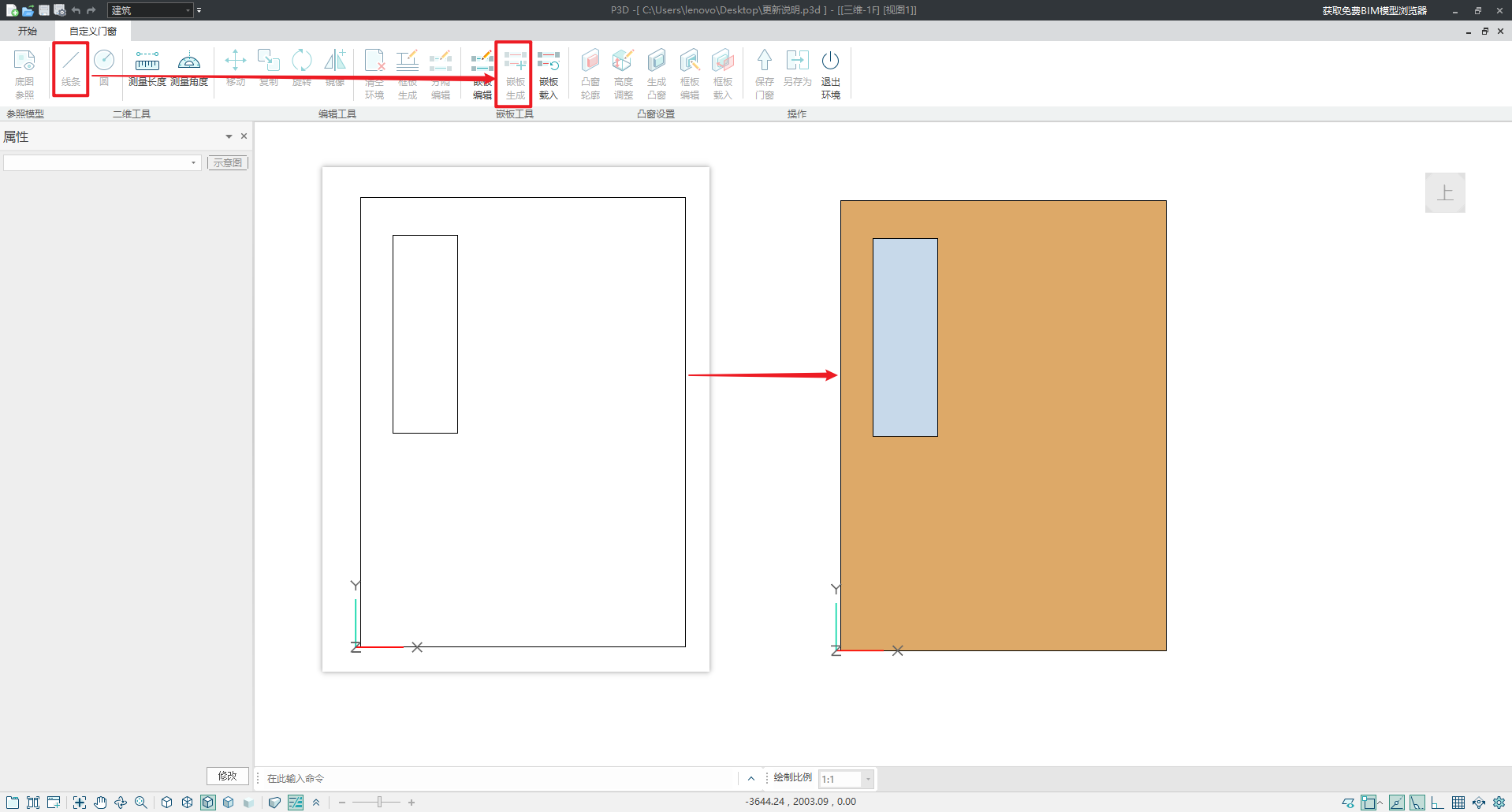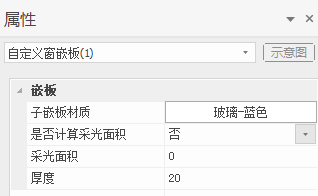 嵌板属性:单机选中嵌板,可在属性栏中修改嵌板的材质、是否计算采光面积、采光面积、厚度属性;