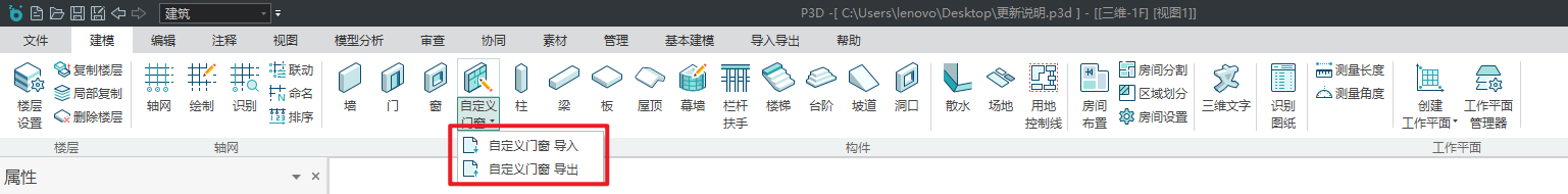 目录 搜索 展开 首页乘车路线版权与商标说明免责声明更新说明20242024R1.02024R1.12024R1.22024R1.32024R1.42024R2.02024R2.12024R2.220232023R1.020222022R3.12022R3.02022R2.12022R2.02022R1.42022R1.32022R1.22022R1.020252025R1.1工作环境最低运行环境启动界面用户操作界面快速访问工具栏视图盒子模型操作视图区命令提示行项目浏览器属性面板多窗口显示设置视图工具条光照亮度三维坐标捕捉设置通用操作文件(平台)功能键临时辅助线抬头工具栏追踪器自定义工具条临时尺寸线参考线、夹点弹出式小面板右键菜单专业建模标高标高绘制楼层管理复制构件局部复制删除构件轴网定位正交轴网轴线绘制识别联动命名排序专业构件墙创建墙编辑墙梁创建梁编辑梁板创建板编辑板柱创建柱编辑柱屋顶创建屋顶编辑屋顶幕墙创建幕墙编辑幕墙门创建门编辑门窗创建窗编辑窗自定义门窗自定义门窗预设自定义飘窗、转角窗框板编辑嵌板编辑自定义门窗的调用与管理自定义门窗导出/导入洞口创建洞口编辑洞口楼梯创建楼梯环境外编辑楼梯环境内编辑楼梯台阶创建台阶编辑台阶坡道创建坡道编辑坡道栏杆扶手创建栏杆编辑栏杆复杂截面管理器栏杆样式散水创建散水编辑散水房间布置房间配置房间分隔区域划分房间设置面层面层面层分格线场地创建场地编辑场地用地控制线创建用地控制线编辑用地控制线三维文字辅助工具识别图纸创建工作平面工作平面管理器基本建模编辑工具专业编辑工具对齐修剪延伸附着布尔剪切剪切面对齐打断端部裁剪倒角裁剪刷新偏移删除附着通用编辑移动镜像删除阵列复制旋转过滤选择过滤器增强过滤器测量长度测量角度测量面积测量标高测量坐标测量组合组合解组开始组暂停组编辑组块块定义块分解块编辑块管理拾取刷新拾取属性刷新属性计算分析计算分析内外墙判定指标分析重叠处理内外墙判定结果注释二维工具线型二维工具填充通用标注逐点标注直径标注半径标注弧长标注角度标注标高标注引出标注箭头引注索引标注多层标注折断线变更云线三维标高标注自动标注通用文字单行文字多行文字文字识别通用表格插入表格&表格编辑视图视图创建3D剖切工具局部剖切创建立面创建剖面门窗大样图纸生成图纸导出图纸清单统计清单生成清单样式清单单位清单结果审查审查流程设置全局属性楼层信息模型自检审查智能审查审查结果数据导出审查报告导出构件查找CIM平台基点设置导出广州汇交格式审查IFC深圳IFC基点设置选择标准建筑赋值空间赋值构件赋值规则配置导出SZ-IFC上海IFC选择标准基点设置楼层设置导出SH-IFC协同链接模型链接P3D链接管理碰撞检查碰撞检查碰撞结果碰撞报告净高分析净高设置净高平面净高检查净高刷新建筑开洞提资云协同合并/拆分工程合并工程批量合并拆分工程管理项目项目信息工程参数材料材料设置复合材料管理器表面材质库素材库二三维构件的导入、导出二维图块导入、导出三维图块编辑、删除二维图块编辑、删除属性修改三维构件二维构件素材修复/精度设置洁具库界面洁具的布置属性修改/更新洁具符号库组件创建bfa组件属性管理参数驱动平面工具实体工具造型工具扫掠体旋转体拉伸体融合体多界面融合截面集布尔运算交集并集差集辅助建模工作平面创建工作平面工作平面管理编辑操作说明临时坐标系组件编辑可见性材质库云端库参数化组件库(平台)类别管理类别属性管理器(平台)楼层属性楼层属性管理器裁剪裁剪方式扣减设置构件子类别构件子类别管理显示全局显示样式构件可见性方案视图覆盖方案注释样式尺寸样式文字样式快捷命令导入导出参照底图导入底图管理参照匹配导入导出导出PMODEL导入PMODEL导出IFC导入IFC导出FBX导入3ds导入SKP导入STEP对接品茗导出图片外部数据控制晨曦深化构件筛选晨曦钢筋显隐晨曦钢筋删除绿色低碳导入BDLS导出BDLS**文字示意**二级文字示意格式模板 暂无相关搜索结果! 自定义门窗导出/导入 使用说明图1 自定义门窗导入导出 该功能可导入/导出已保存的自定义门窗,实现跨项目的复用。