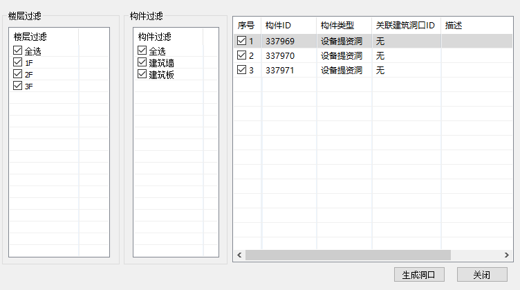 - <洞口过滤>:右侧显示所有机电提资洞口,勾选需要进行开洞的洞口。