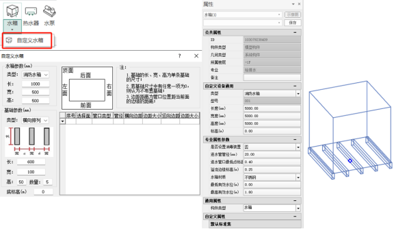 | 1 | 类型 | 自动读取 | 1)需要包含关键字,如生活水箱、消防水箱、软化水箱等;2)水箱出水管必须和相应的给排水管道进行有效连接,如给水、泄水、消火栓、喷淋等系统管道;3)水箱进水管道如采用空气间隙隔断,需要按照图纸要求,将进水立管通到水箱内(不需要和水箱连接,空间关系交叉即可),立管的底标高应保证和图纸一致; | |