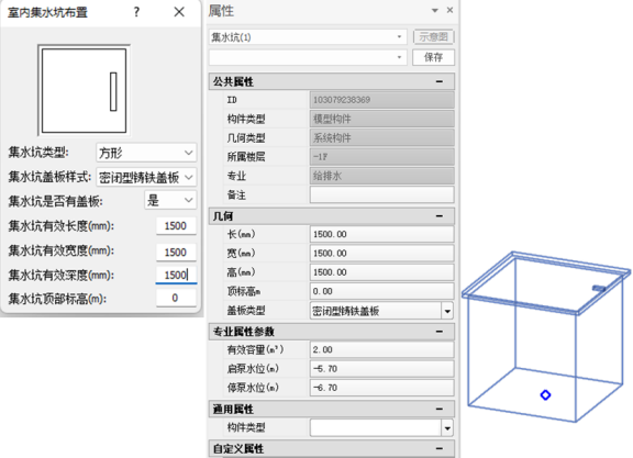 | 1 | 系统类型名称 | 自动读取 | 1)名称需要包含构件的关键字,集水井、集水坑;2)排水管道必须伸到集水坑内部,潜污泵需要放在集水坑内部; | |