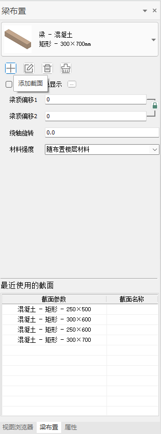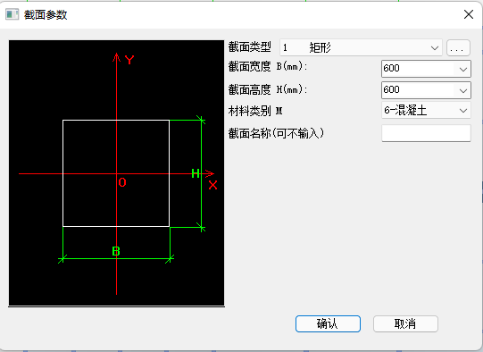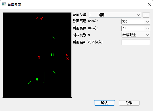 4.新建结构梁截面。选择【建模】选项卡中的【梁】,弹出的梁布置对话框如图2.3-5所示。点击梁布置对话框中的新建,弹出截面参数对话框如图2.3-6所示。选择截面类型和材料类别,输入截面宽度和高度数值,点击【确定】;