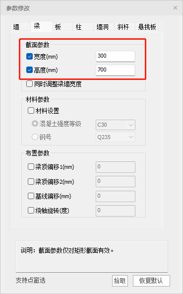 9.点击【编辑】选项卡中的【参数修改】,弹出对话框如图2.6-9所示。用户需勾选需要修改的参数,勾选后改参数项后面的输入框被激活。输入数值后,选择目标构件即完成修改;
