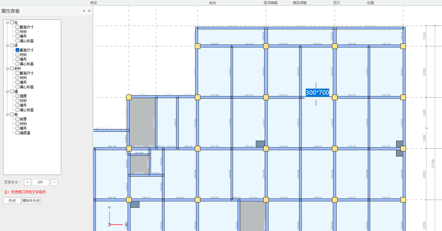 除此之外,用户还可点击【编辑】选项卡中的【构件参数】。在展开的“属性查看”栏中,勾选【梁】的【截面尺寸】,模型将显示梁的截面尺寸参数。双击尺寸参数,将启动在位编辑,编辑完成后单击空白处,截面将自动替换。