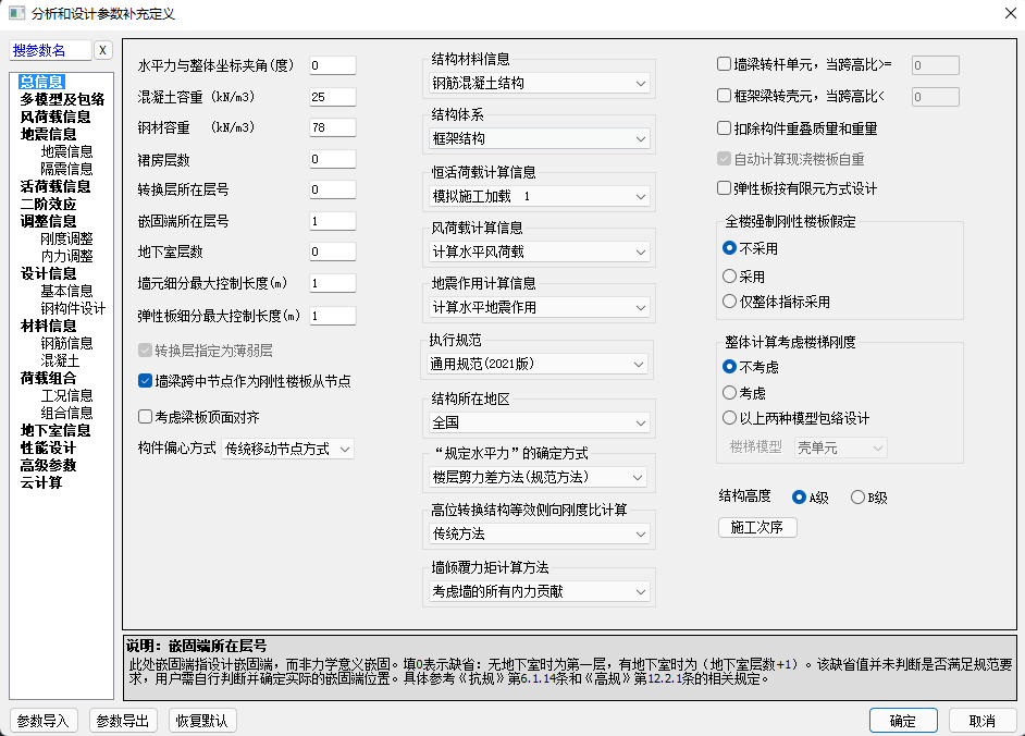 2.点击【前处理及计算】选项卡中的【参数定义】,如图2.6-3所示。在此对话框内,用户可设置模型计算参数,包括材料容重、地震荷载、风荷载和工况等,点击【确定】保存;