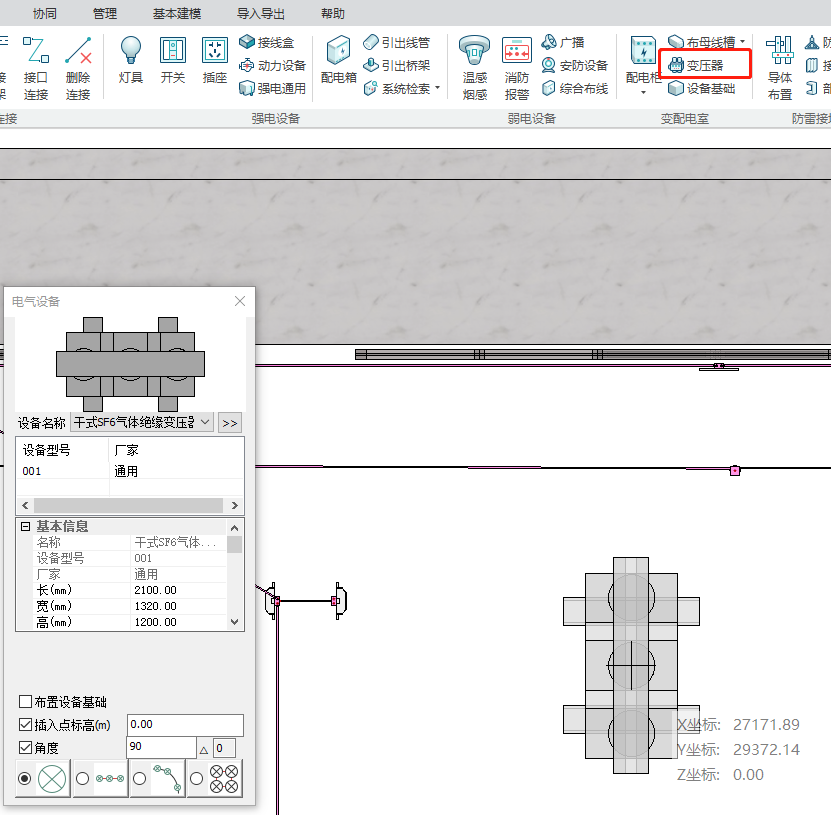 目录 搜索 展开 PKPM-BIM 项目应用案例教程第1章 建筑设计模块1.1 创建新项目1.1.1 创建新项目1.1.2 项目参数设置1.1.3 楼层设置1.1.4 放置轴网元素1.1.5 创建场地1.2 创建一层建筑主体1.2.1 创建柱1.2.2 创建墙1.2.3 创建楼板1.2.4 放置门窗1.2.4.1 普通门窗的设置1.2.4.2 常用设置集的配置1.2.4.3 自定义门窗设置1.2.4.4 放置门1.2.4.5 放置窗1.2.5 放置幕墙1.2.5.1 创建幕墙1.2.5.2 幕墙与墙体的剪切1.2.5.3 幕墙编辑1.2.6 创建房间、区域、楼梯1.2.6.1 创建房间1.2.6.2 创建防火分区1.2.6.3 创建楼梯1.3 创建二层建筑主体1.3.1 过滤选择1.3.2 局部复制1.3.3 二层构件修改1.3.3.1 墙体调整1.3.3.2 创建栏杆扶手1.3.3.3 放置门窗1.3.3.4 放置楼梯1.3.3.5 板上开洞1.3.3.6 创建房间和区域1.4创建三、四层建筑主体1.4.1 楼层复制1.4.2 楼板轮廓修改1.4.3 修改门窗1.5 创建屋顶层1.5.1 增强过滤器1.5.2 局部复制1.5.3 .同类构件的快速删除1.5.4 .墙体调整1.5.5 创建楼板1.5.6 创建门窗1.5.7 创建楼梯、栏杆1.5.8 创建房间和区域1.6 细部模型建立1.6.1 补充构件 1.6.1.1 增加台阶和坡道 1.6.1.2 增加栏杆扶手 1.6.1.3 增加雨棚 1.6.1.4 增加烟道 1.6.1.5 烟道洞口布置 1.6.2 放置素材1.6.2.1 素材库1.6.2.2 符号库1.6.2.3 参数化组件库1.7 清单1.8 智能审查1.9 出图1.9.1 出图流程介绍1.9.2 视图创建1.9.3 标注制图1.9.4 显示方案设置1.9.5 视图属性设置1.9.6 生成图纸1.9.7 成果导出第2章 结构设计模块2.1 新建项目 2.2 建立轴网 2.3 上部结构建模 2.4 楼层管理 2.5 计算分析前处理 2.6 计算结果查看 2.7 生成施工图 2.8 施工图审查第3章 暖通设计模块3.1 基本设置3.1.1 读取项目3.1.2 选择楼层3.1.3工程设置3.2 风系统建模3.2.1 风管绘制3.2.2 风口布置及连接3.3 空调水系统建模3.3.1 水管绘制3.3.2 风机盘管布置3.3.3 设备智能连接3.4 多联机系统3.4.1 室内外机布置3.4.2 多联机连管3.4.3 系统划分3.5 楼层复制3.6 材料统计3.6.1 材料统计3.6.2 材料结果查询3.7 模型审查3.7.1 全局属性3.7.2 条文审查3.7.3 调整模型3.8 暖通出图3.8.1 出图流程介绍3.8.2 视图映射创建3.8.3 标注制图3.8.4 显示方案设置3.8.5 视图属性设置3.8.6 生成图纸3.8.7 成果导出第4章 给排水设计模块4.1 设置4.1.1基本设置4.1.2系统设置4.2 给排水系统建模4.2.1 给排水管道绘制4.2.2 卫浴设备布置4.2.3 智能连接4.3 消火栓系统建模4.3.1 消火栓管绘制4.3.2 消火栓灭火器布置及连接4.4 喷淋系统建模4.4.1 喷头布置4.4.2 喷头连接4.4.3 识图建模4.5楼层复制4.6 材料统计4.6.1 材料统计4.6.2 材料结果查询4.7模型审查4.7.1 全局属性 4.7.2 条文审查4.7.3 调整模型4.8给排水出图4.8.1出图流程介绍4.8.2视图映射创建4.8.3标注制图4.8.4显示方案设置4.8.5视图属性设置4.8.6生成图纸4.8.7成果导出第5章 电气设计模块5.1 基本设置5.1.1 基本设置5.1.2 工程设置5.2 配电系统布置 5.2.1 配电柜布置5.2.2配电室桥架布置5.2.3配电室电缆沟布置5.2.4配电室变压器布置5.2.5配电箱布置5.3 照明系统布置5.3.1正常照明点位布置5.3.2应急照明照明点位布置5.4 火灾自动报警系统布置5.4.1 温感烟感点位布置5.4.2 消防广播点位布置5.4.3手报、声光报警器、消火栓启泵按钮、消防电话点位布置5.4.4消防端子箱布置5.5 弱电安防系统布置5.5.1监控摄像头点位布置5.5.2弱电插座点位布置5.5.3弱电机柜点位布置5.5.4识图建模5.6 平面布线5.6.1 设备连接5.6.2线管避让5.7楼层复制5.7.1 楼层复制5.8 材料统计5.8.1 材料统计5.8.2 材料结果查询5.9模型审查5.9.1 智能审查规则5.9.2 审查流程第6章 协同设计模块6.1 碰撞检查6.2 开洞提资6.2.1 生成开洞提资条件6.2.2 实际洞口处理生成6.3 净高分析6.3.1 净高设置6.3.2 净高平面6.3.3 净高检查6.4 模型链接6.5 合并工程 暂无相关搜索结果! 5.2.4配电室变压器布置 5.2.4配电室变压器布置操作步骤:1.在配电室功能栏中,选择变压器功能,进行变压器的布置,如下图图5.2-10; 图5.2-10 变压器布置