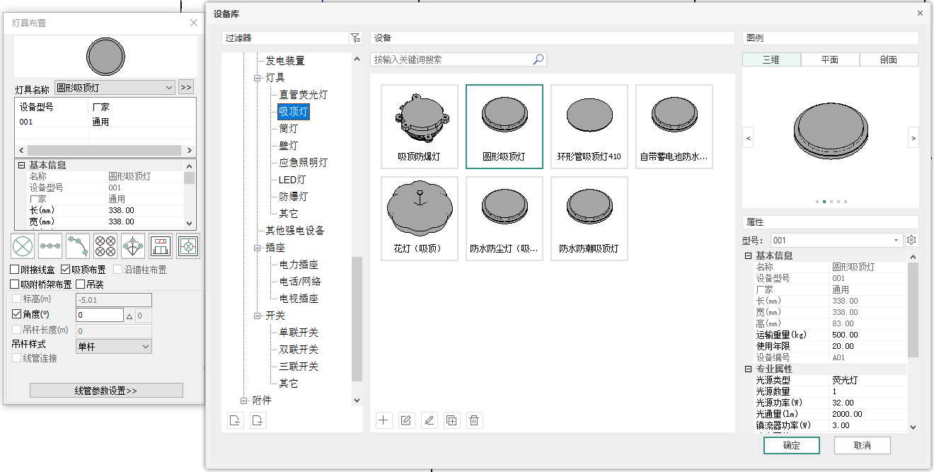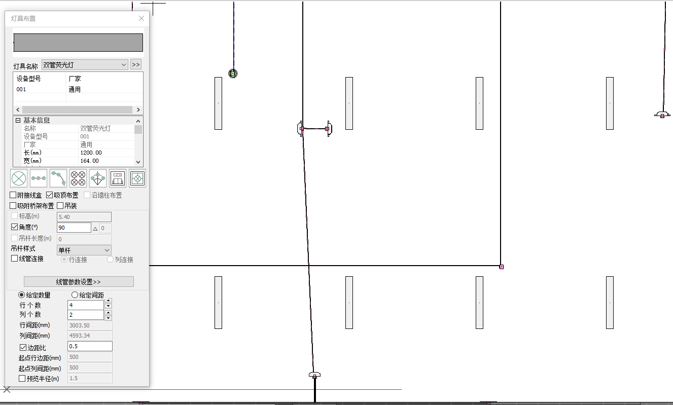 1.在设备布置功能栏中,点击灯具,选择双管荧光灯,矩形布置,修改行列灯具数量为4x2,布置方式为吸顶布置,勾选边距比0.5,光标定位1-A,3-A,3-D轴柱中点框选按矩形,点击鼠标左键调整灯具方向为90°,再次点击左键完成布置,如图5.3-1;