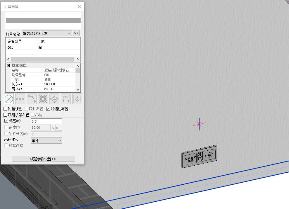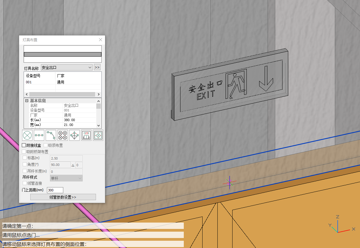 1.在设备布置功能栏中,点击灯具,选择安全出口灯/疏散出口灯,本项目首层高度为5.4m,故首层选用大型标志灯。布置方式为门上布置距门300,点击左键完成布置,如图5.3-9;