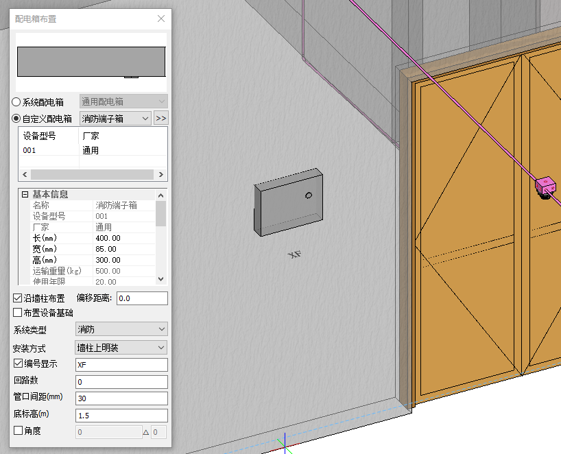 目录 搜索 展开 PKPM-BIM 项目应用案例教程第1章 建筑设计模块1.1 创建新项目1.1.1 创建新项目1.1.2 项目参数设置1.1.3 楼层设置1.1.4 放置轴网元素1.1.5 创建场地1.2 创建一层建筑主体1.2.1 创建柱1.2.2 创建墙1.2.3 创建楼板1.2.4 放置门窗1.2.4.1 普通门窗的设置1.2.4.2 常用设置集的配置1.2.4.3 自定义门窗设置1.2.4.4 放置门1.2.4.5 放置窗1.2.5 放置幕墙1.2.5.1 创建幕墙1.2.5.2 幕墙与墙体的剪切1.2.5.3 幕墙编辑1.2.6 创建房间、区域、楼梯1.2.6.1 创建房间1.2.6.2 创建防火分区1.2.6.3 创建楼梯1.3 创建二层建筑主体1.3.1 过滤选择1.3.2 局部复制1.3.3 二层构件修改1.3.3.1 墙体调整1.3.3.2 创建栏杆扶手1.3.3.3 放置门窗1.3.3.4 放置楼梯1.3.3.5 板上开洞1.3.3.6 创建房间和区域1.4创建三、四层建筑主体1.4.1 楼层复制1.4.2 楼板轮廓修改1.4.3 修改门窗1.5 创建屋顶层1.5.1 增强过滤器1.5.2 局部复制1.5.3 .同类构件的快速删除1.5.4 .墙体调整1.5.5 创建楼板1.5.6 创建门窗1.5.7 创建楼梯、栏杆1.5.8 创建房间和区域1.6 细部模型建立1.6.1 补充构件 1.6.1.1 增加台阶和坡道 1.6.1.2 增加栏杆扶手 1.6.1.3 增加雨棚 1.6.1.4 增加烟道 1.6.1.5 烟道洞口布置 1.6.2 放置素材1.6.2.1 素材库1.6.2.2 符号库1.6.2.3 参数化组件库1.7 清单1.8 智能审查1.9 出图1.9.1 出图流程介绍1.9.2 视图创建1.9.3 标注制图1.9.4 显示方案设置1.9.5 视图属性设置1.9.6 生成图纸1.9.7 成果导出第2章 结构设计模块2.1 新建项目 2.2 建立轴网 2.3 上部结构建模 2.4 楼层管理 2.5 计算分析前处理 2.6 计算结果查看 2.7 生成施工图 2.8 施工图审查第3章 暖通设计模块3.1 基本设置3.1.1 读取项目3.1.2 选择楼层3.1.3工程设置3.2 风系统建模3.2.1 风管绘制3.2.2 风口布置及连接3.3 空调水系统建模3.3.1 水管绘制3.3.2 风机盘管布置3.3.3 设备智能连接3.4 多联机系统3.4.1 室内外机布置3.4.2 多联机连管3.4.3 系统划分3.5 楼层复制3.6 材料统计3.6.1 材料统计3.6.2 材料结果查询3.7 模型审查3.7.1 全局属性3.7.2 条文审查3.7.3 调整模型3.8 暖通出图3.8.1 出图流程介绍3.8.2 视图映射创建3.8.3 标注制图3.8.4 显示方案设置3.8.5 视图属性设置3.8.6 生成图纸3.8.7 成果导出第4章 给排水设计模块4.1 设置4.1.1基本设置4.1.2系统设置4.2 给排水系统建模4.2.1 给排水管道绘制4.2.2 卫浴设备布置4.2.3 智能连接4.3 消火栓系统建模4.3.1 消火栓管绘制4.3.2 消火栓灭火器布置及连接4.4 喷淋系统建模4.4.1 喷头布置4.4.2 喷头连接4.4.3 识图建模4.5楼层复制4.6 材料统计4.6.1 材料统计4.6.2 材料结果查询4.7模型审查4.7.1 全局属性 4.7.2 条文审查4.7.3 调整模型4.8给排水出图4.8.1出图流程介绍4.8.2视图映射创建4.8.3标注制图4.8.4显示方案设置4.8.5视图属性设置4.8.6生成图纸4.8.7成果导出第5章 电气设计模块5.1 基本设置5.1.1 基本设置5.1.2 工程设置5.2 配电系统布置 5.2.1 配电柜布置5.2.2配电室桥架布置5.2.3配电室电缆沟布置5.2.4配电室变压器布置5.2.5配电箱布置5.3 照明系统布置5.3.1正常照明点位布置5.3.2应急照明照明点位布置5.4 火灾自动报警系统布置5.4.1 温感烟感点位布置5.4.2 消防广播点位布置5.4.3手报、声光报警器、消火栓启泵按钮、消防电话点位布置5.4.4消防端子箱布置5.5 弱电安防系统布置5.5.1监控摄像头点位布置5.5.2弱电插座点位布置5.5.3弱电机柜点位布置5.5.4识图建模5.6 平面布线5.6.1 设备连接5.6.2线管避让5.7楼层复制5.7.1 楼层复制5.8 材料统计5.8.1 材料统计5.8.2 材料结果查询5.9模型审查5.9.1 智能审查规则5.9.2 审查流程第6章 协同设计模块6.1 碰撞检查6.2 开洞提资6.2.1 生成开洞提资条件6.2.2 实际洞口处理生成6.3 净高分析6.3.1 净高设置6.3.2 净高平面6.3.3 净高检查6.4 模型链接6.5 合并工程 暂无相关搜索结果! 5.4.4消防端子箱布置 5.4.4消防端子箱布置操作步骤:1.按照和照明配电箱的同样方式,在弱电井内布置一处消防端子箱,井内明装,底标高为1.5m。如图5.4-4 图5.4-4 消防端子箱布置