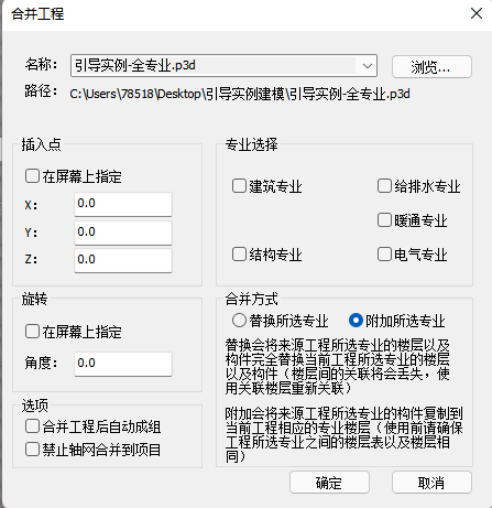 图6.4 -1 合并工程【专业选择】可以选择要合并的专业,支持同时选择多个专业进行合并;另外用户根据项目需求,选择“替换所选专业”还是“复制所选专业”;具体释义如下: