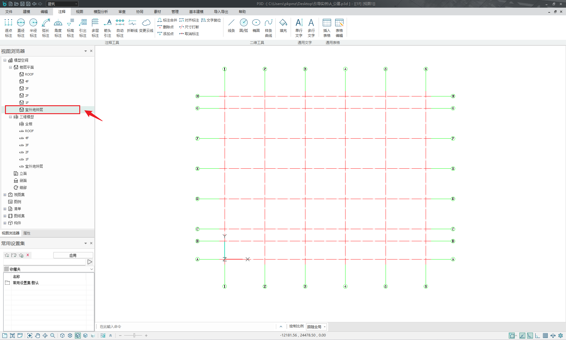 目录 搜索 展开 PKPM-BIM 项目应用案例教程第1章 建筑设计模块1.1 创建新项目1.1.1 创建新项目1.1.2 项目参数设置1.1.3 楼层设置1.1.4 放置轴网元素1.1.5 创建场地1.2 创建一层建筑主体1.2.1 创建柱1.2.2 创建墙1.2.3 创建楼板1.2.4 放置门窗1.2.4.1 普通门窗的设置1.2.4.2 常用设置集的配置1.2.4.3 自定义门窗设置1.2.4.4 放置门1.2.4.5 放置窗1.2.5 放置幕墙1.2.5.1 创建幕墙1.2.5.2 幕墙与墙体的剪切1.2.5.3 幕墙编辑1.2.6 创建房间、区域、楼梯1.2.6.1 创建房间1.2.6.2 创建防火分区1.2.6.3 创建楼梯1.3 创建二层建筑主体1.3.1 过滤选择1.3.2 局部复制1.3.3 二层构件修改1.3.3.1 墙体调整1.3.3.2 创建栏杆扶手1.3.3.3 放置门窗1.3.3.4 放置楼梯1.3.3.5 板上开洞1.3.3.6 创建房间和区域1.4创建三、四层建筑主体1.4.1 楼层复制1.4.2 楼板轮廓修改1.4.3 修改门窗1.5 创建屋顶层1.5.1 增强过滤器1.5.2 局部复制1.5.3 .同类构件的快速删除1.5.4 .墙体调整1.5.5 创建楼板1.5.6 创建门窗1.5.7 创建楼梯、栏杆1.5.8 创建房间和区域1.6 细部模型建立1.6.1 补充构件 1.6.1.1 增加台阶和坡道 1.6.1.2 增加栏杆扶手 1.6.1.3 增加雨棚 1.6.1.4 增加烟道 1.6.1.5 烟道洞口布置 1.6.2 放置素材1.6.2.1 素材库1.6.2.2 符号库1.6.2.3 参数化组件库1.7 清单1.8 智能审查1.9 出图1.9.1 出图流程介绍1.9.2 视图创建1.9.3 标注制图1.9.4 显示方案设置1.9.5 视图属性设置1.9.6 生成图纸1.9.7 成果导出第2章 结构设计模块2.1 新建项目 2.2 建立轴网 2.3 上部结构建模 2.4 楼层管理 2.5 计算分析前处理 2.6 计算结果查看 2.7 生成施工图 2.8 施工图审查第3章 暖通设计模块3.1 基本设置3.1.1 读取项目3.1.2 选择楼层3.1.3工程设置3.2 风系统建模3.2.1 风管绘制3.2.2 风口布置及连接3.3 空调水系统建模3.3.1 水管绘制3.3.2 风机盘管布置3.3.3 设备智能连接3.4 多联机系统3.4.1 室内外机布置3.4.2 多联机连管3.4.3 系统划分3.5 楼层复制3.6 材料统计3.6.1 材料统计3.6.2 材料结果查询3.7 模型审查3.7.1 全局属性3.7.2 条文审查3.7.3 调整模型3.8 暖通出图3.8.1 出图流程介绍3.8.2 视图映射创建3.8.3 标注制图3.8.4 显示方案设置3.8.5 视图属性设置3.8.6 生成图纸3.8.7 成果导出第4章 给排水设计模块4.1 设置4.1.1基本设置4.1.2系统设置4.2 给排水系统建模4.2.1 给排水管道绘制4.2.2 卫浴设备布置4.2.3 智能连接4.3 消火栓系统建模4.3.1 消火栓管绘制4.3.2 消火栓灭火器布置及连接4.4 喷淋系统建模4.4.1 喷头布置4.4.2 喷头连接4.4.3 识图建模4.5楼层复制4.6 材料统计4.6.1 材料统计4.6.2 材料结果查询4.7模型审查4.7.1 全局属性 4.7.2 条文审查4.7.3 调整模型4.8给排水出图4.8.1出图流程介绍4.8.2视图映射创建4.8.3标注制图4.8.4显示方案设置4.8.5视图属性设置4.8.6生成图纸4.8.7成果导出第5章 电气设计模块5.1 基本设置5.1.1 基本设置5.1.2 工程设置5.2 配电系统布置 5.2.1 配电柜布置5.2.2配电室桥架布置5.2.3配电室电缆沟布置5.2.4配电室变压器布置5.2.5配电箱布置5.3 照明系统布置5.3.1正常照明点位布置5.3.2应急照明照明点位布置5.4 火灾自动报警系统布置5.4.1 温感烟感点位布置5.4.2 消防广播点位布置5.4.3手报、声光报警器、消火栓启泵按钮、消防电话点位布置5.4.4消防端子箱布置5.5 弱电安防系统布置5.5.1监控摄像头点位布置5.5.2弱电插座点位布置5.5.3弱电机柜点位布置5.5.4识图建模5.6 平面布线5.6.1 设备连接5.6.2线管避让5.7楼层复制5.7.1 楼层复制5.8 材料统计5.8.1 材料统计5.8.2 材料结果查询5.9模型审查5.9.1 智能审查规则5.9.2 审查流程第6章 协同设计模块6.1 碰撞检查6.2 开洞提资6.2.1 生成开洞提资条件6.2.2 实际洞口处理生成6.3 净高分析6.3.1 净高设置6.3.2 净高平面6.3.3 净高检查6.4 模型链接6.5 合并工程 暂无相关搜索结果! 1.1.5 创建场地 操作步骤: 在视图浏览器中双击打开“室外地坪层”,如图所示; 图 进入场地构件的布置楼层 选择“建模”菜单,点击“场地”工具图标。在属性面板中设置参数,场地厚度500、基准偏移0、结构样式仅顶面、建筑材料为土壤、表面材质草-绿色,如图所示; 图 场地属性参数设置 在界面绘图区域居中位置显示绘制方式,点击选择“矩形”绘制,在绘图区域合适位置,绘制完成地形模型,如图所示; 小贴士:若选择“多边形”绘制,跟随鼠标的绘制小面板,可随时切换绘制的选择,最后右键可快速自动完成场地的闭合; 图 场地模型