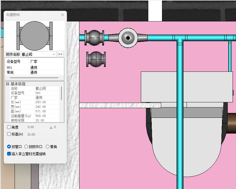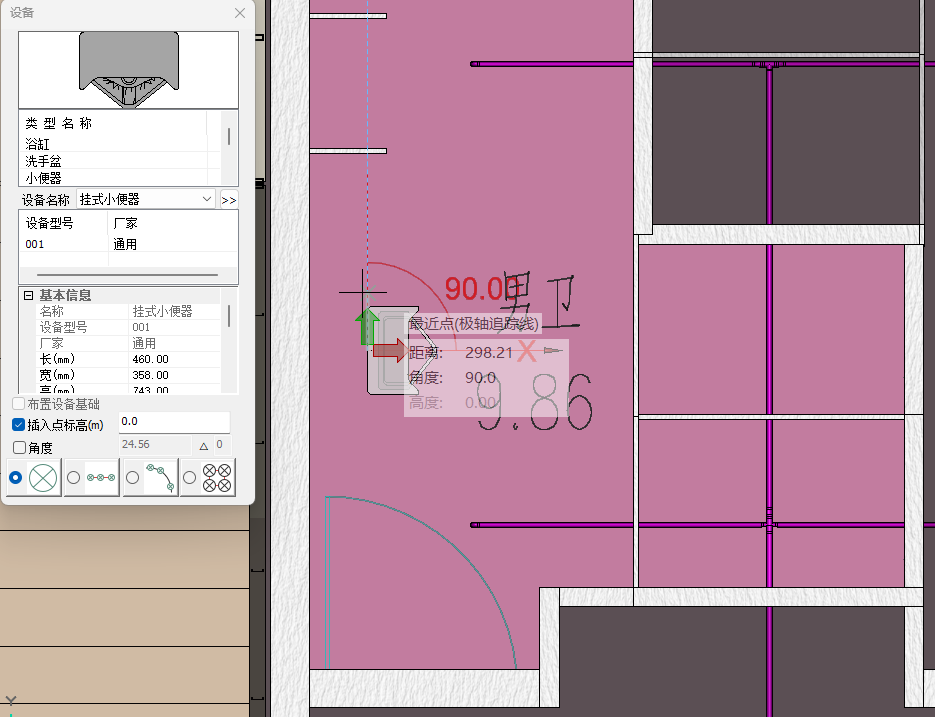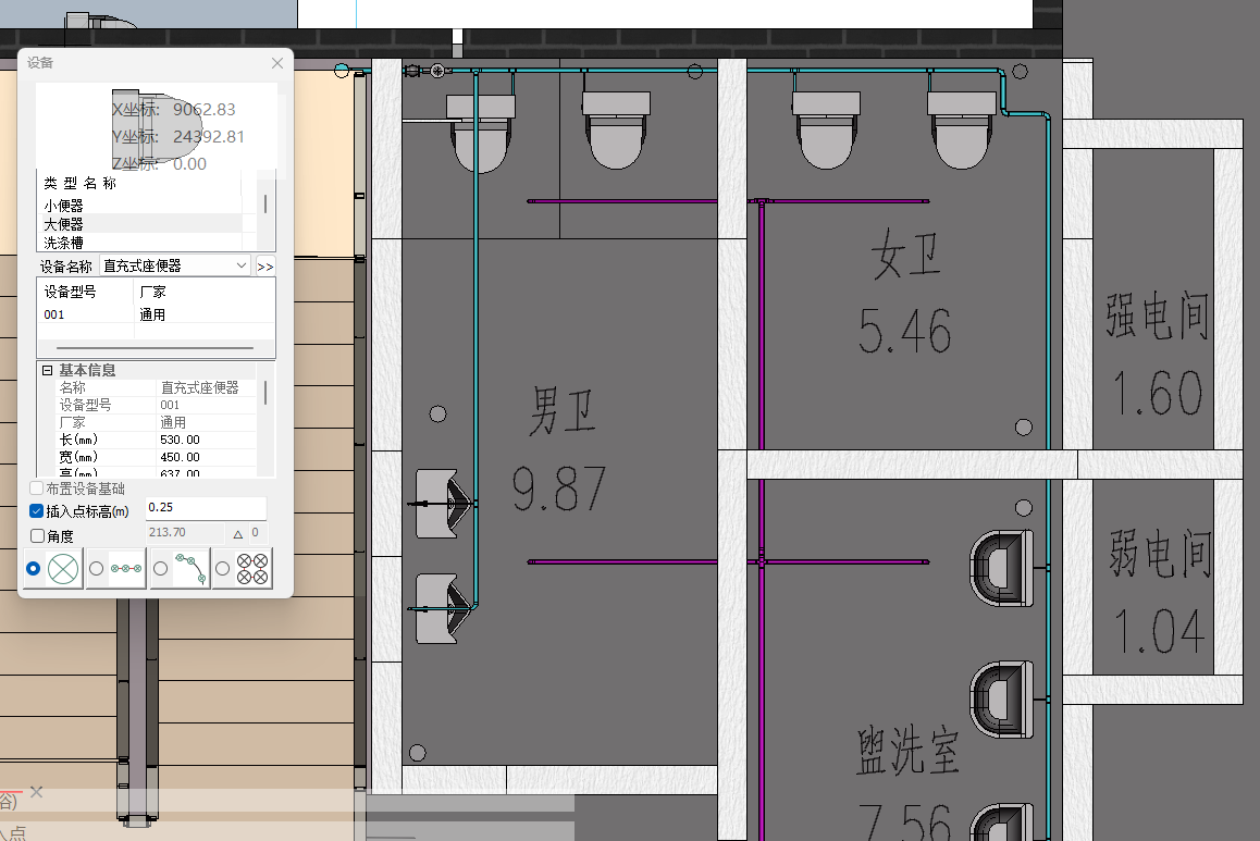 1.点击设备命令栏中卫浴选项,选择大便器设备类型,并选择设备名称为直充式座便器,勾选插入点标高,将插入点标高调整为0.25m;选择直线布置形式,并将布置数量调整为2,起点距离和终点距离调整为1000,捕捉墙体,通过“Shift”键锁轴确保布置在同一水平线上,确定大便器布置点位,并调整放置方向。如图4.2-4;