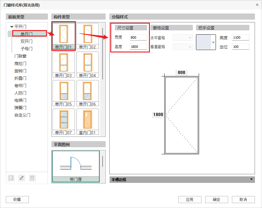 目录 搜索 展开 PKPM-BIM 项目应用案例教程第1章 建筑设计模块1.1 创建新项目1.1.1 创建新项目1.1.2 项目参数设置1.1.3 楼层设置1.1.4 放置轴网元素1.1.5 创建场地1.2 创建一层建筑主体1.2.1 创建柱1.2.2 创建墙1.2.3 创建楼板1.2.4 放置门窗1.2.4.1 普通门窗的设置1.2.4.2 常用设置集的配置1.2.4.3 自定义门窗设置1.2.4.4 放置门1.2.4.5 放置窗1.2.5 放置幕墙1.2.5.1 创建幕墙1.2.5.2 幕墙与墙体的剪切1.2.5.3 幕墙编辑1.2.6 创建房间、区域、楼梯1.2.6.1 创建房间1.2.6.2 创建防火分区1.2.6.3 创建楼梯1.3 创建二层建筑主体1.3.1 过滤选择1.3.2 局部复制1.3.3 二层构件修改1.3.3.1 墙体调整1.3.3.2 创建栏杆扶手1.3.3.3 放置门窗1.3.3.4 放置楼梯1.3.3.5 板上开洞1.3.3.6 创建房间和区域1.4创建三、四层建筑主体1.4.1 楼层复制1.4.2 楼板轮廓修改1.4.3 修改门窗1.5 创建屋顶层1.5.1 增强过滤器1.5.2 局部复制1.5.3 .同类构件的快速删除1.5.4 .墙体调整1.5.5 创建楼板1.5.6 创建门窗1.5.7 创建楼梯、栏杆1.5.8 创建房间和区域1.6 细部模型建立1.6.1 补充构件 1.6.1.1 增加台阶和坡道 1.6.1.2 增加栏杆扶手 1.6.1.3 增加雨棚 1.6.1.4 增加烟道 1.6.1.5 烟道洞口布置 1.6.2 放置素材1.6.2.1 素材库1.6.2.2 符号库1.6.2.3 参数化组件库1.7 清单1.8 智能审查1.9 出图1.9.1 出图流程介绍1.9.2 视图创建1.9.3 标注制图1.9.4 显示方案设置1.9.5 视图属性设置1.9.6 生成图纸1.9.7 成果导出第2章 结构设计模块2.1 新建项目 2.2 建立轴网 2.3 上部结构建模 2.4 楼层管理 2.5 计算分析前处理 2.6 计算结果查看 2.7 生成施工图 2.8 施工图审查第3章 暖通设计模块3.1 基本设置3.1.1 读取项目3.1.2 选择楼层3.1.3工程设置3.2 风系统建模3.2.1 风管绘制3.2.2 风口布置及连接3.3 空调水系统建模3.3.1 水管绘制3.3.2 风机盘管布置3.3.3 设备智能连接3.4 多联机系统3.4.1 室内外机布置3.4.2 多联机连管3.4.3 系统划分3.5 楼层复制3.6 材料统计3.6.1 材料统计3.6.2 材料结果查询3.7 模型审查3.7.1 全局属性3.7.2 条文审查3.7.3 调整模型3.8 暖通出图3.8.1 出图流程介绍3.8.2 视图映射创建3.8.3 标注制图3.8.4 显示方案设置3.8.5 视图属性设置3.8.6 生成图纸3.8.7 成果导出第4章 给排水设计模块4.1 设置4.1.1基本设置4.1.2系统设置4.2 给排水系统建模4.2.1 给排水管道绘制4.2.2 卫浴设备布置4.2.3 智能连接4.3 消火栓系统建模4.3.1 消火栓管绘制4.3.2 消火栓灭火器布置及连接4.4 喷淋系统建模4.4.1 喷头布置4.4.2 喷头连接4.4.3 识图建模4.5楼层复制4.6 材料统计4.6.1 材料统计4.6.2 材料结果查询4.7模型审查4.7.1 全局属性 4.7.2 条文审查4.7.3 调整模型4.8给排水出图4.8.1出图流程介绍4.8.2视图映射创建4.8.3标注制图4.8.4显示方案设置4.8.5视图属性设置4.8.6生成图纸4.8.7成果导出第5章 电气设计模块5.1 基本设置5.1.1 基本设置5.1.2 工程设置5.2 配电系统布置 5.2.1 配电柜布置5.2.2配电室桥架布置5.2.3配电室电缆沟布置5.2.4配电室变压器布置5.2.5配电箱布置5.3 照明系统布置5.3.1正常照明点位布置5.3.2应急照明照明点位布置5.4 火灾自动报警系统布置5.4.1 温感烟感点位布置5.4.2 消防广播点位布置5.4.3手报、声光报警器、消火栓启泵按钮、消防电话点位布置5.4.4消防端子箱布置5.5 弱电安防系统布置5.5.1监控摄像头点位布置5.5.2弱电插座点位布置5.5.3弱电机柜点位布置5.5.4识图建模5.6 平面布线5.6.1 设备连接5.6.2线管避让5.7楼层复制5.7.1 楼层复制5.8 材料统计5.8.1 材料统计5.8.2 材料结果查询5.9模型审查5.9.1 智能审查规则5.9.2 审查流程第6章 协同设计模块6.1 碰撞检查6.2 开洞提资6.2.1 生成开洞提资条件6.2.2 实际洞口处理生成6.3 净高分析6.3.1 净高设置6.3.2 净高平面6.3.3 净高检查6.4 模型链接6.5 合并工程 暂无相关搜索结果! 1.2.4.1 普通门窗的设置 操作步骤: 点击“门”工具,在属性面板中设置门参数设置,以“FM丙0818”为例,如图所示;小贴士: 修改门类型、尺寸,门编号实时联动 图 门属性 点击属性面板中“门样式选择”按钮,弹出的门样式面板中选择“单开门01”,如图所示;小贴士:可在门窗样式库界面可以输入数值,修改分隔尺寸 图 门窗样式库面板 点击确认,完成普通门的设定。普通窗户设定同普通门。