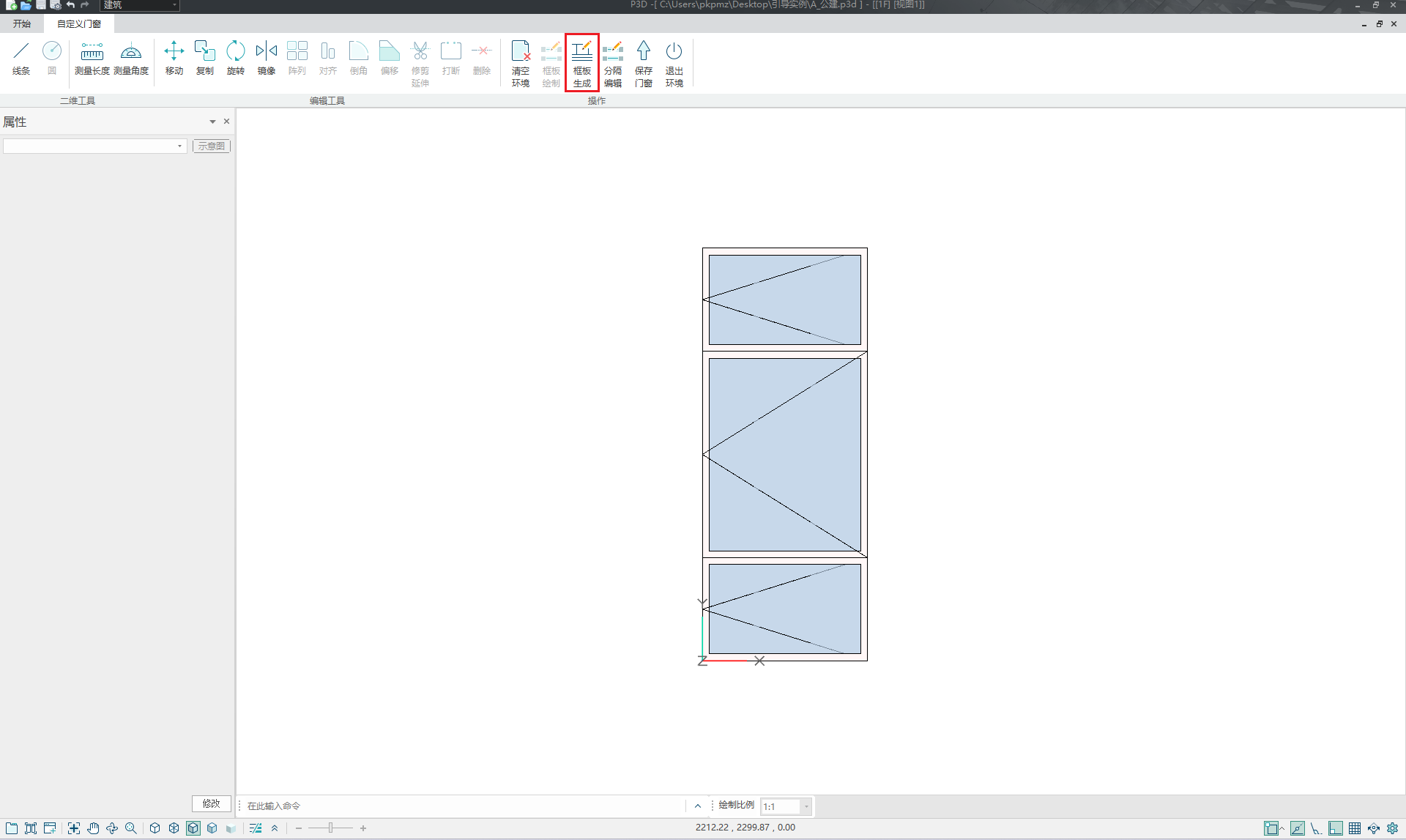 ”,软件自动识别封闭区域,生成默认样式的窗框及玻璃嵌板。如图所示;