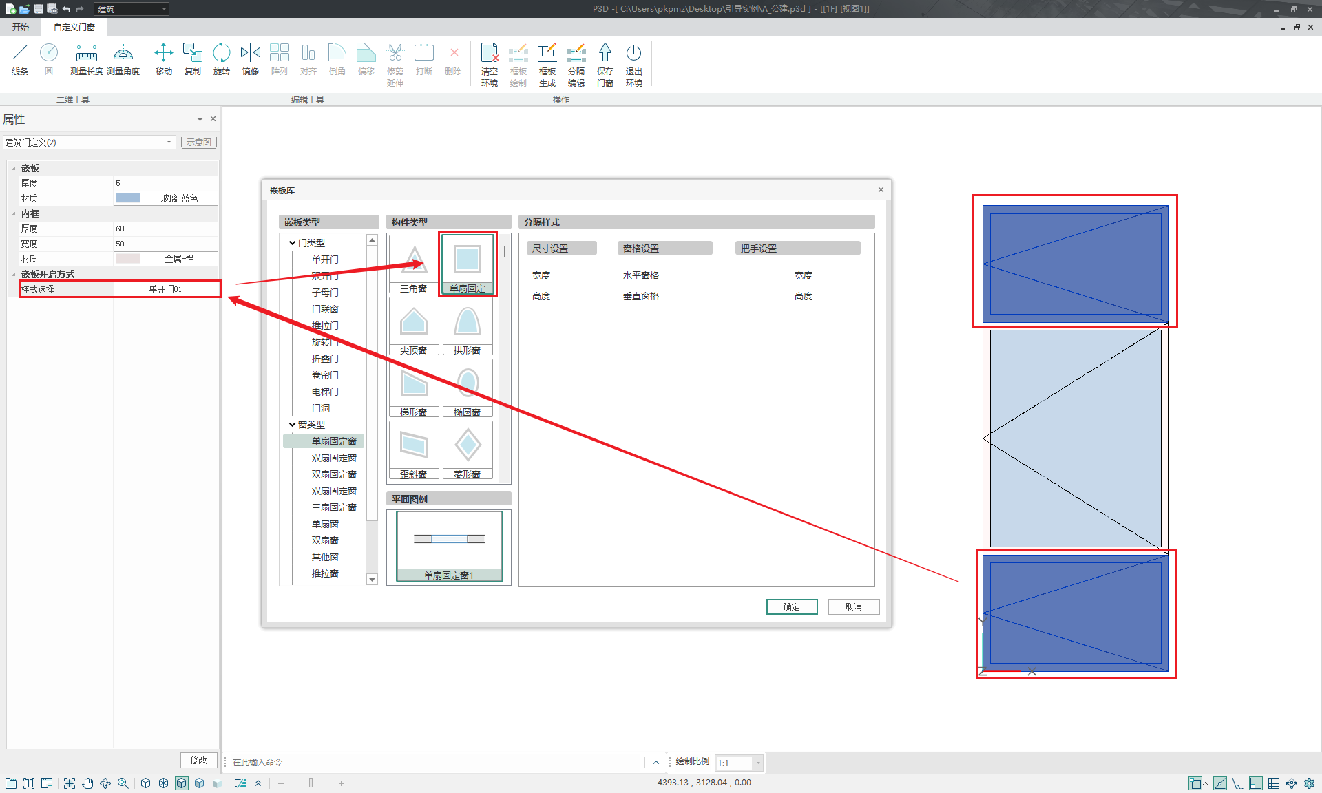 - 选中需要修改开启样式的上下两块框板,而后在左侧属性栏对嵌板样式进行修改,设置为单扇固定窗。如图所示;