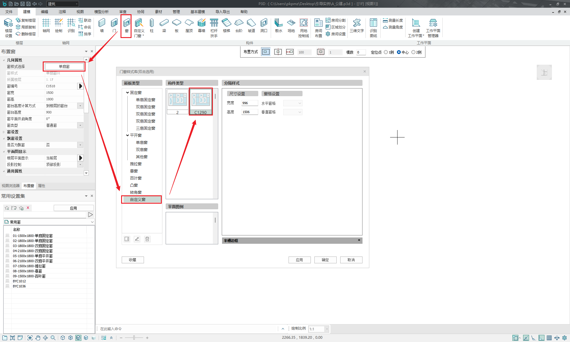 ”。 - 退出独立编辑环境后,点击“窗”工具,在属性面板中进行窗户样式的修改,找到自定义窗的分类,选择上述创建的自定义窗,点击确定,如图所示;
