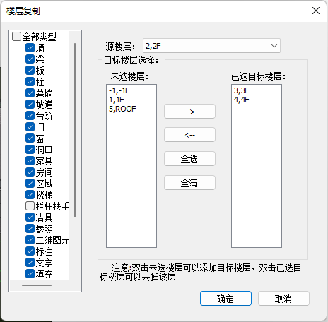 目录 搜索 展开 PKPM-BIM 项目应用案例教程第1章 建筑设计模块1.1 创建新项目1.1.1 创建新项目1.1.2 项目参数设置1.1.3 楼层设置1.1.4 放置轴网元素1.1.5 创建场地1.2 创建一层建筑主体1.2.1 创建柱1.2.2 创建墙1.2.3 创建楼板1.2.4 放置门窗1.2.4.1 普通门窗的设置1.2.4.2 常用设置集的配置1.2.4.3 自定义门窗设置1.2.4.4 放置门1.2.4.5 放置窗1.2.5 放置幕墙1.2.5.1 创建幕墙1.2.5.2 幕墙与墙体的剪切1.2.5.3 幕墙编辑1.2.6 创建房间、区域、楼梯1.2.6.1 创建房间1.2.6.2 创建防火分区1.2.6.3 创建楼梯1.3 创建二层建筑主体1.3.1 过滤选择1.3.2 局部复制1.3.3 二层构件修改1.3.3.1 墙体调整1.3.3.2 创建栏杆扶手1.3.3.3 放置门窗1.3.3.4 放置楼梯1.3.3.5 板上开洞1.3.3.6 创建房间和区域1.4创建三、四层建筑主体1.4.1 楼层复制1.4.2 楼板轮廓修改1.4.3 修改门窗1.5 创建屋顶层1.5.1 增强过滤器1.5.2 局部复制1.5.3 .同类构件的快速删除1.5.4 .墙体调整1.5.5 创建楼板1.5.6 创建门窗1.5.7 创建楼梯、栏杆1.5.8 创建房间和区域1.6 细部模型建立1.6.1 补充构件 1.6.1.1 增加台阶和坡道 1.6.1.2 增加栏杆扶手 1.6.1.3 增加雨棚 1.6.1.4 增加烟道 1.6.1.5 烟道洞口布置 1.6.2 放置素材1.6.2.1 素材库1.6.2.2 符号库1.6.2.3 参数化组件库1.7 清单1.8 智能审查1.9 出图1.9.1 出图流程介绍1.9.2 视图创建1.9.3 标注制图1.9.4 显示方案设置1.9.5 视图属性设置1.9.6 生成图纸1.9.7 成果导出第2章 结构设计模块2.1 新建项目 2.2 建立轴网 2.3 上部结构建模 2.4 楼层管理 2.5 计算分析前处理 2.6 计算结果查看 2.7 生成施工图 2.8 施工图审查第3章 暖通设计模块3.1 基本设置3.1.1 读取项目3.1.2 选择楼层3.1.3工程设置3.2 风系统建模3.2.1 风管绘制3.2.2 风口布置及连接3.3 空调水系统建模3.3.1 水管绘制3.3.2 风机盘管布置3.3.3 设备智能连接3.4 多联机系统3.4.1 室内外机布置3.4.2 多联机连管3.4.3 系统划分3.5 楼层复制3.6 材料统计3.6.1 材料统计3.6.2 材料结果查询3.7 模型审查3.7.1 全局属性3.7.2 条文审查3.7.3 调整模型3.8 暖通出图3.8.1 出图流程介绍3.8.2 视图映射创建3.8.3 标注制图3.8.4 显示方案设置3.8.5 视图属性设置3.8.6 生成图纸3.8.7 成果导出第4章 给排水设计模块4.1 设置4.1.1基本设置4.1.2系统设置4.2 给排水系统建模4.2.1 给排水管道绘制4.2.2 卫浴设备布置4.2.3 智能连接4.3 消火栓系统建模4.3.1 消火栓管绘制4.3.2 消火栓灭火器布置及连接4.4 喷淋系统建模4.4.1 喷头布置4.4.2 喷头连接4.4.3 识图建模4.5楼层复制4.6 材料统计4.6.1 材料统计4.6.2 材料结果查询4.7模型审查4.7.1 全局属性 4.7.2 条文审查4.7.3 调整模型4.8给排水出图4.8.1出图流程介绍4.8.2视图映射创建4.8.3标注制图4.8.4显示方案设置4.8.5视图属性设置4.8.6生成图纸4.8.7成果导出第5章 电气设计模块5.1 基本设置5.1.1 基本设置5.1.2 工程设置5.2 配电系统布置 5.2.1 配电柜布置5.2.2配电室桥架布置5.2.3配电室电缆沟布置5.2.4配电室变压器布置5.2.5配电箱布置5.3 照明系统布置5.3.1正常照明点位布置5.3.2应急照明照明点位布置5.4 火灾自动报警系统布置5.4.1 温感烟感点位布置5.4.2 消防广播点位布置5.4.3手报、声光报警器、消火栓启泵按钮、消防电话点位布置5.4.4消防端子箱布置5.5 弱电安防系统布置5.5.1监控摄像头点位布置5.5.2弱电插座点位布置5.5.3弱电机柜点位布置5.5.4识图建模5.6 平面布线5.6.1 设备连接5.6.2线管避让5.7楼层复制5.7.1 楼层复制5.8 材料统计5.8.1 材料统计5.8.2 材料结果查询5.9模型审查5.9.1 智能审查规则5.9.2 审查流程第6章 协同设计模块6.1 碰撞检查6.2 开洞提资6.2.1 生成开洞提资条件6.2.2 实际洞口处理生成6.3 净高分析6.3.1 净高设置6.3.2 净高平面6.3.3 净高检查6.4 模型链接6.5 合并工程 暂无相关搜索结果! 1.4.1 楼层复制 在“建模”菜单下,选择并点击“复制楼层”,如图所示; 图 楼层复制工具 在弹出楼层复制对话框中设置,源楼层为2F,目标楼层选择3F、4F,点击“确定”; 图 楼层复制面板 点击“确定”完成三、四层楼层复制,点击项目浏览器的“全楼”,在三维中查看复制后的效果; 图 三、四层楼层复制后的效果