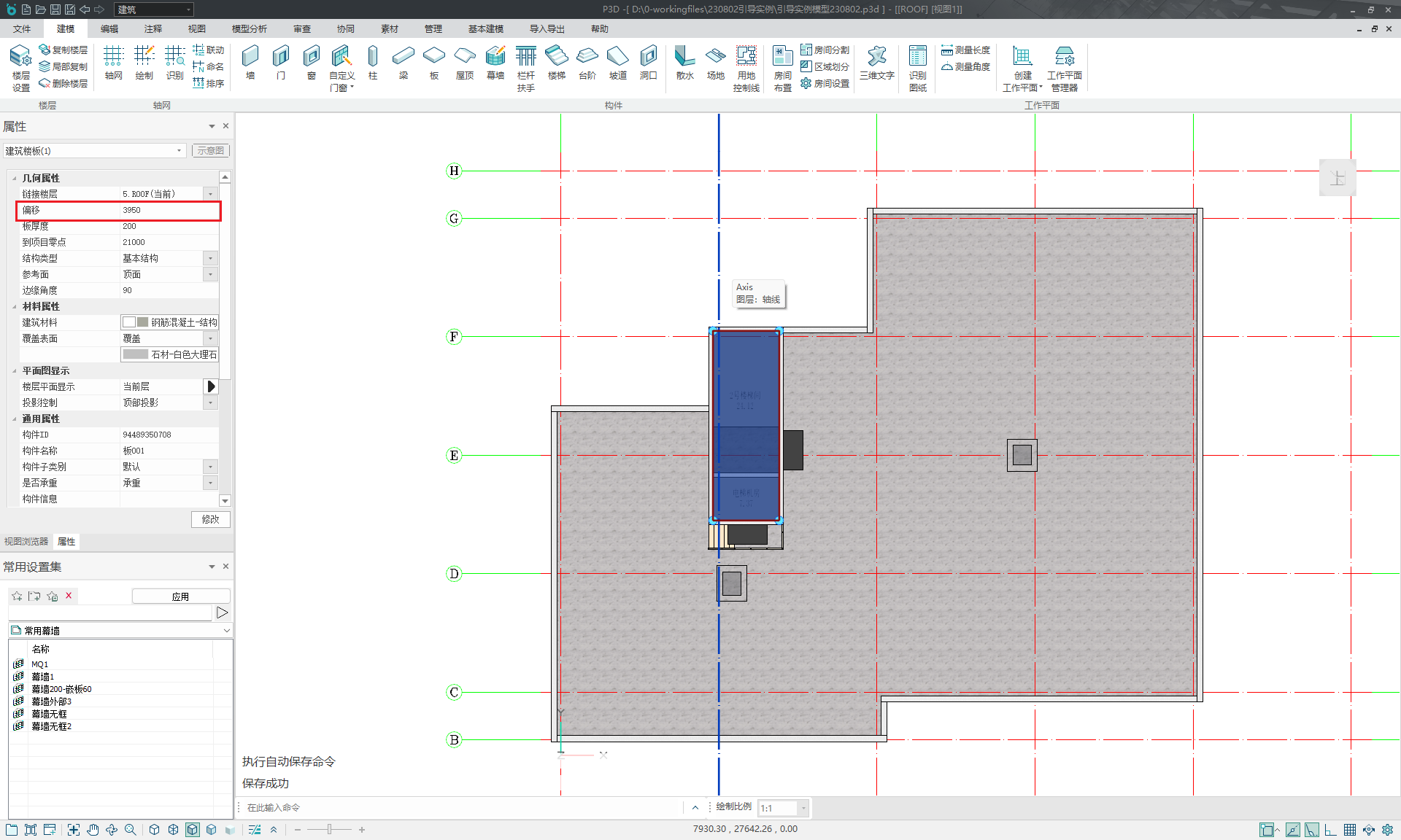 目录 搜索 展开 PKPM-BIM 项目应用案例教程第1章 建筑设计模块1.1 创建新项目1.1.1 创建新项目1.1.2 项目参数设置1.1.3 楼层设置1.1.4 放置轴网元素1.1.5 创建场地1.2 创建一层建筑主体1.2.1 创建柱1.2.2 创建墙1.2.3 创建楼板1.2.4 放置门窗1.2.4.1 普通门窗的设置1.2.4.2 常用设置集的配置1.2.4.3 自定义门窗设置1.2.4.4 放置门1.2.4.5 放置窗1.2.5 放置幕墙1.2.5.1 创建幕墙1.2.5.2 幕墙与墙体的剪切1.2.5.3 幕墙编辑1.2.6 创建房间、区域、楼梯1.2.6.1 创建房间1.2.6.2 创建防火分区1.2.6.3 创建楼梯1.3 创建二层建筑主体1.3.1 过滤选择1.3.2 局部复制1.3.3 二层构件修改1.3.3.1 墙体调整1.3.3.2 创建栏杆扶手1.3.3.3 放置门窗1.3.3.4 放置楼梯1.3.3.5 板上开洞1.3.3.6 创建房间和区域1.4创建三、四层建筑主体1.4.1 楼层复制1.4.2 楼板轮廓修改1.4.3 修改门窗1.5 创建屋顶层1.5.1 增强过滤器1.5.2 局部复制1.5.3 .同类构件的快速删除1.5.4 .墙体调整1.5.5 创建楼板1.5.6 创建门窗1.5.7 创建楼梯、栏杆1.5.8 创建房间和区域1.6 细部模型建立1.6.1 补充构件 1.6.1.1 增加台阶和坡道 1.6.1.2 增加栏杆扶手 1.6.1.3 增加雨棚 1.6.1.4 增加烟道 1.6.1.5 烟道洞口布置 1.6.2 放置素材1.6.2.1 素材库1.6.2.2 符号库1.6.2.3 参数化组件库1.7 清单1.8 智能审查1.9 出图1.9.1 出图流程介绍1.9.2 视图创建1.9.3 标注制图1.9.4 显示方案设置1.9.5 视图属性设置1.9.6 生成图纸1.9.7 成果导出第2章 结构设计模块2.1 新建项目 2.2 建立轴网 2.3 上部结构建模 2.4 楼层管理 2.5 计算分析前处理 2.6 计算结果查看 2.7 生成施工图 2.8 施工图审查第3章 暖通设计模块3.1 基本设置3.1.1 读取项目3.1.2 选择楼层3.1.3工程设置3.2 风系统建模3.2.1 风管绘制3.2.2 风口布置及连接3.3 空调水系统建模3.3.1 水管绘制3.3.2 风机盘管布置3.3.3 设备智能连接3.4 多联机系统3.4.1 室内外机布置3.4.2 多联机连管3.4.3 系统划分3.5 楼层复制3.6 材料统计3.6.1 材料统计3.6.2 材料结果查询3.7 模型审查3.7.1 全局属性3.7.2 条文审查3.7.3 调整模型3.8 暖通出图3.8.1 出图流程介绍3.8.2 视图映射创建3.8.3 标注制图3.8.4 显示方案设置3.8.5 视图属性设置3.8.6 生成图纸3.8.7 成果导出第4章 给排水设计模块4.1 设置4.1.1基本设置4.1.2系统设置4.2 给排水系统建模4.2.1 给排水管道绘制4.2.2 卫浴设备布置4.2.3 智能连接4.3 消火栓系统建模4.3.1 消火栓管绘制4.3.2 消火栓灭火器布置及连接4.4 喷淋系统建模4.4.1 喷头布置4.4.2 喷头连接4.4.3 识图建模4.5楼层复制4.6 材料统计4.6.1 材料统计4.6.2 材料结果查询4.7模型审查4.7.1 全局属性 4.7.2 条文审查4.7.3 调整模型4.8给排水出图4.8.1出图流程介绍4.8.2视图映射创建4.8.3标注制图4.8.4显示方案设置4.8.5视图属性设置4.8.6生成图纸4.8.7成果导出第5章 电气设计模块5.1 基本设置5.1.1 基本设置5.1.2 工程设置5.2 配电系统布置 5.2.1 配电柜布置5.2.2配电室桥架布置5.2.3配电室电缆沟布置5.2.4配电室变压器布置5.2.5配电箱布置5.3 照明系统布置5.3.1正常照明点位布置5.3.2应急照明照明点位布置5.4 火灾自动报警系统布置5.4.1 温感烟感点位布置5.4.2 消防广播点位布置5.4.3手报、声光报警器、消火栓启泵按钮、消防电话点位布置5.4.4消防端子箱布置5.5 弱电安防系统布置5.5.1监控摄像头点位布置5.5.2弱电插座点位布置5.5.3弱电机柜点位布置5.5.4识图建模5.6 平面布线5.6.1 设备连接5.6.2线管避让5.7楼层复制5.7.1 楼层复制5.8 材料统计5.8.1 材料统计5.8.2 材料结果查询5.9模型审查5.9.1 智能审查规则5.9.2 审查流程第6章 协同设计模块6.1 碰撞检查6.2 开洞提资6.2.1 生成开洞提资条件6.2.2 实际洞口处理生成6.3 净高分析6.3.1 净高设置6.3.2 净高平面6.3.3 净高检查6.4 模型链接6.5 合并工程 暂无相关搜索结果! 1.5.5 创建楼板 参照1.2.3节的方式创建屋顶楼板,完成后效果如图所示: 图 创建屋顶层楼板 参照1.3.3.5章,修改屋顶楼板与楼梯平台的交接,并删除电梯井处的楼板,完成后效果如图所示: 图 修改屋顶层楼板 参照1.2.3节的方式创建电梯机房层楼板,链接楼层为5层,偏移高度设置为3950,具体属性如图所示: 图 创建电梯机房顶部楼板的位置及参数 完成后效果如图所示 图 电梯机房楼板创建完成后的效果