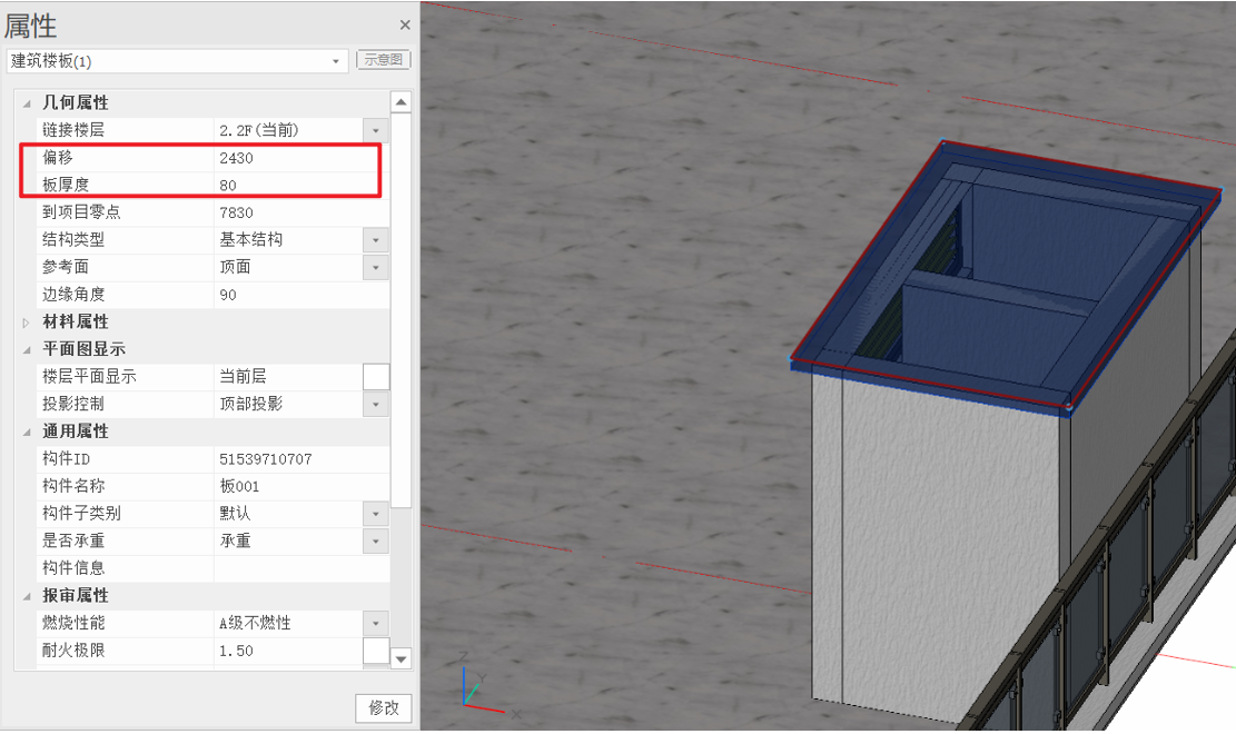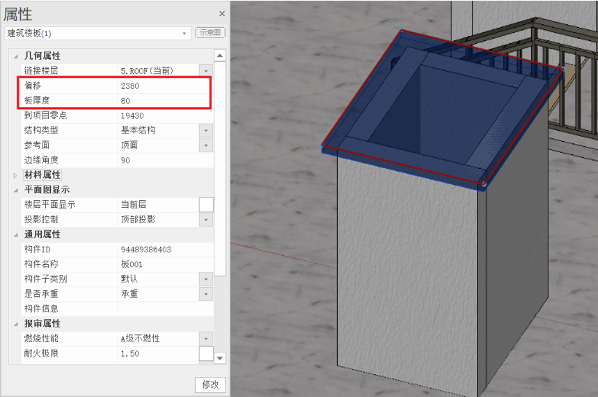 - 使用楼板工具,在烟道上绘制盖板,板四边相对墙体外侧偏移100mm,板厚80mm;