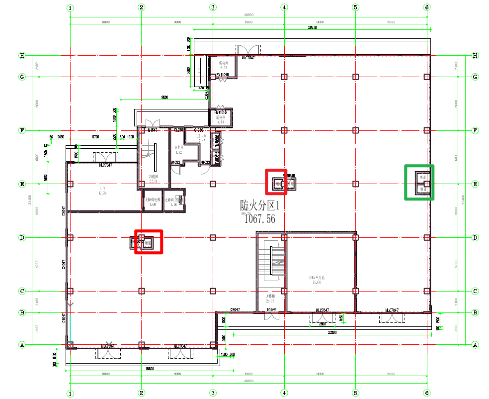 图 一层中需要局部复制的烟道(注:红色框里的复制到屋顶,绿色框里的复制到2层)