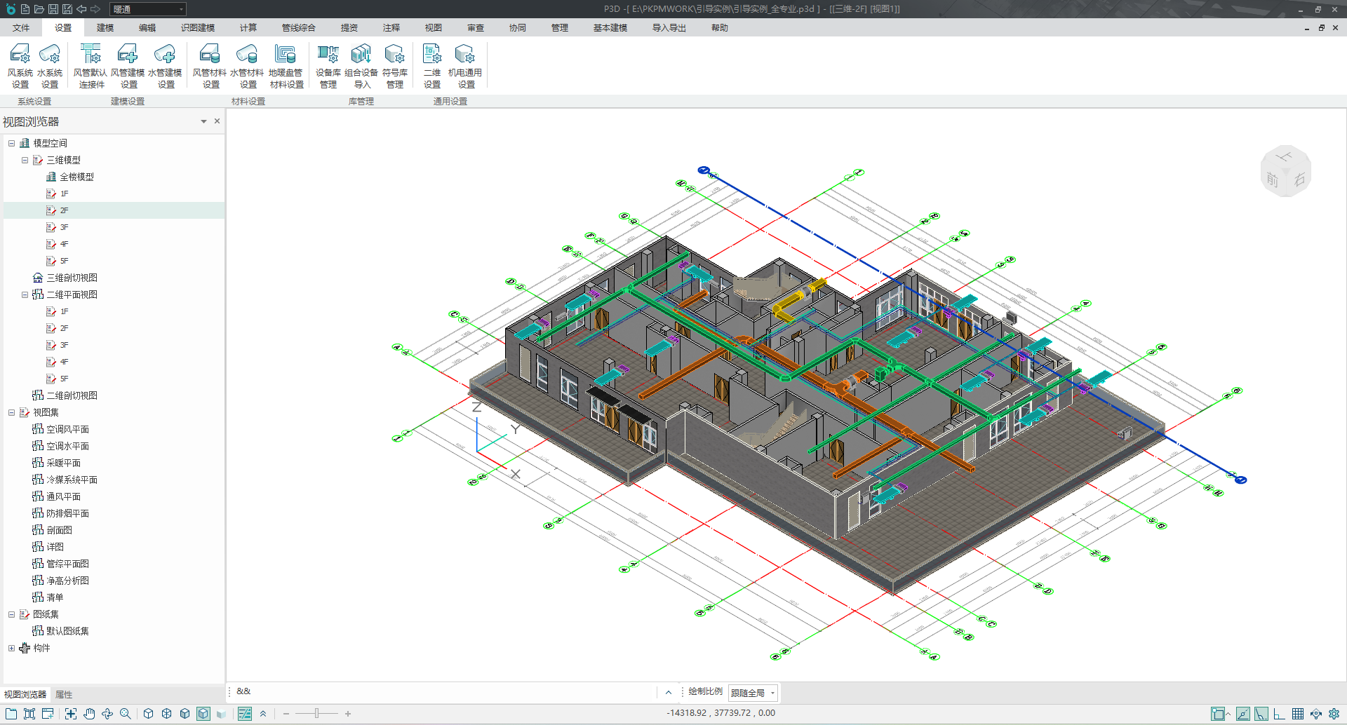 1. PKPM-BIM 项目对于建筑楼层的命名与机电读取楼层的命名方式有所不同,在视图参照中建筑楼层显示的为楼层顺序,而机电读取的为楼层命名。如本项目(包含-1层地坪,14层建筑,5层屋顶)共计6层,在软件中建筑视图参照以楼层16与其相对应,机电视图参照以-1~5层对应。 例如:暖通专业下,楼层列表中的楼层1,对应本项目-1层建筑。