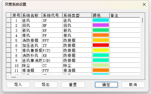 2.点击系统设置-风系统设置,对风管系统的系统名称、系统代号、系统类型和颜色等进行默认设置,水系统设置同理,如图 3.1-8;