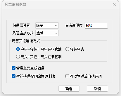 3.点击建模设置–风管建模设置,弹出风管绘制参数界面,在弯管变径连接方式选项中,选择“弯头+变径、弯头在粗管端”,并勾选“管道交叉生成四通”和“智能处理被删除管道末端”,如图3.1-9;