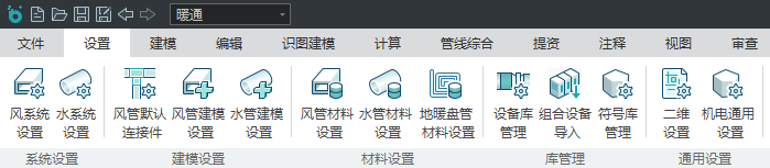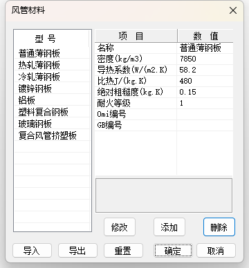 5.在管材设置菜单下,点击风管材料设置,在界面中对风管材料名称、风管材料属性进行设置和修改;水管材料设置和地热盘管材料设置同理。以水管系统为例,如图 3.1-11;