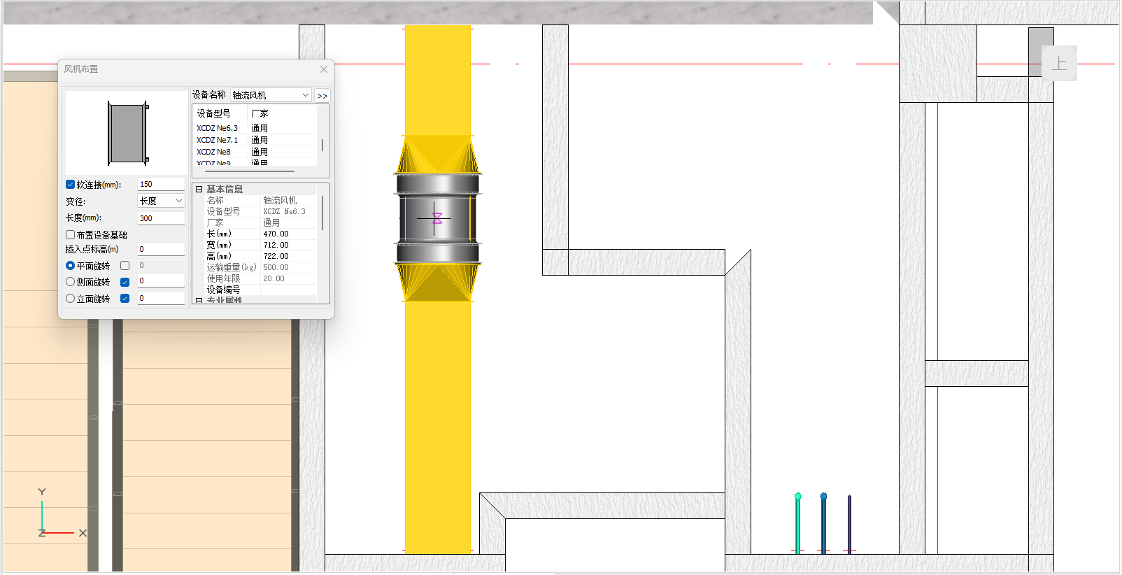 附件功能栏中点击风阀,可自动识别管道完成布置,完成风机、风阀的添加,如图3.3-5;