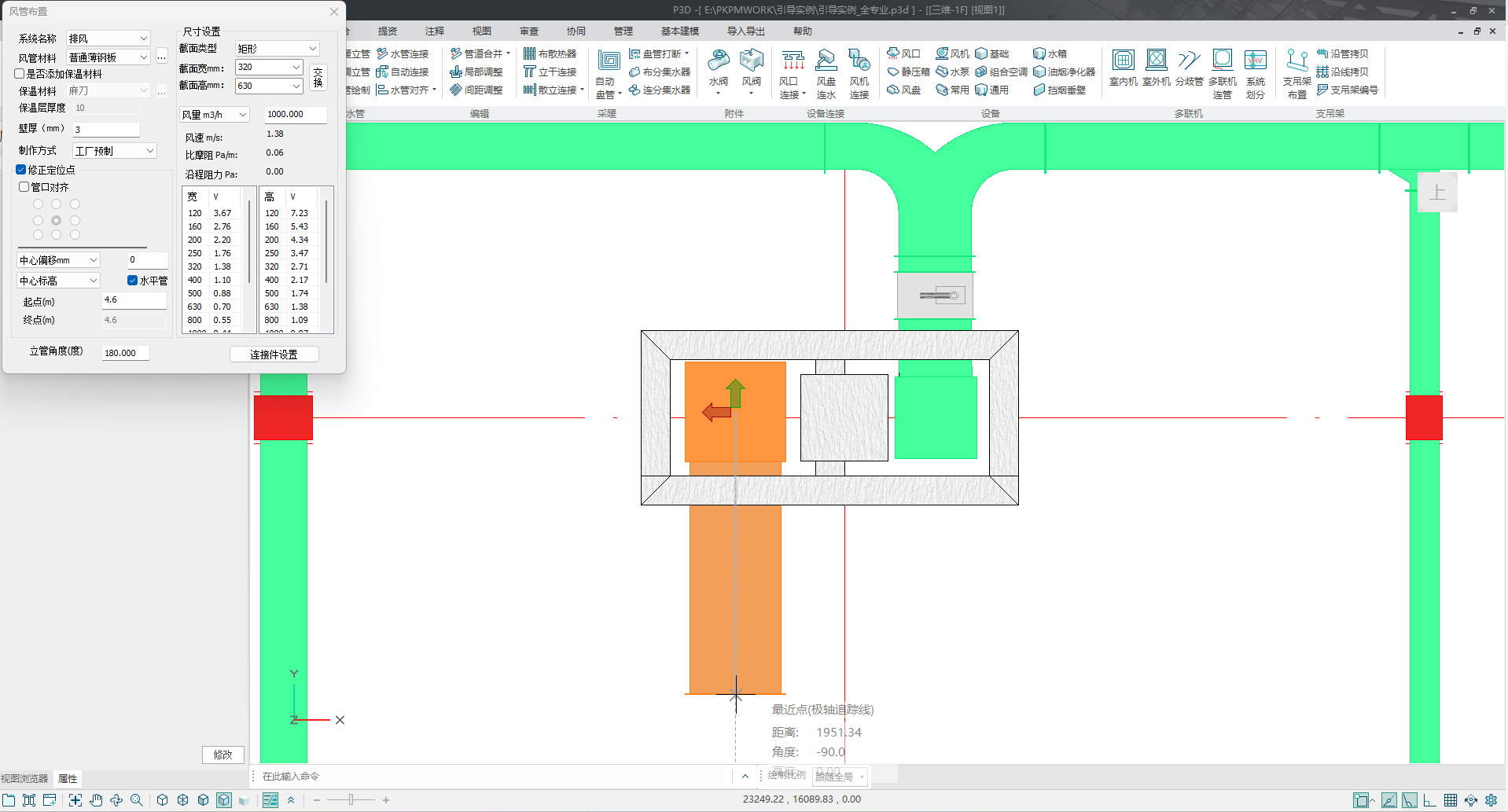 点击风管工具栏–风管绘制,从风立管中心引出干管,选择风管系统形式及截面类型等参数,布置一段截面宽和高修改为 630mm和320mm,并调整标高为4.6m,绘制好干管,如图 3.2-1;
