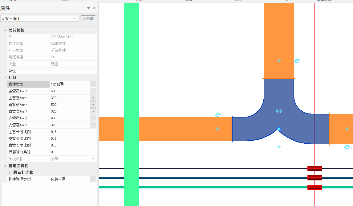 对于变径及弯头等构件的应用,可直接调整管径及管道方向,通过软件智能连接完成绘制,对于三通处的连接处理,可由以上方式,先确定支管管道再由弯头夹点引出直管,如图3.2-3。自动生成的连接件也可替换成其他类型,点击风管工具栏–三通,类型选择为Y型三通–Y型普通,布置方式为替换,点击需要替换的三通,完成替换,如图3.2-4。