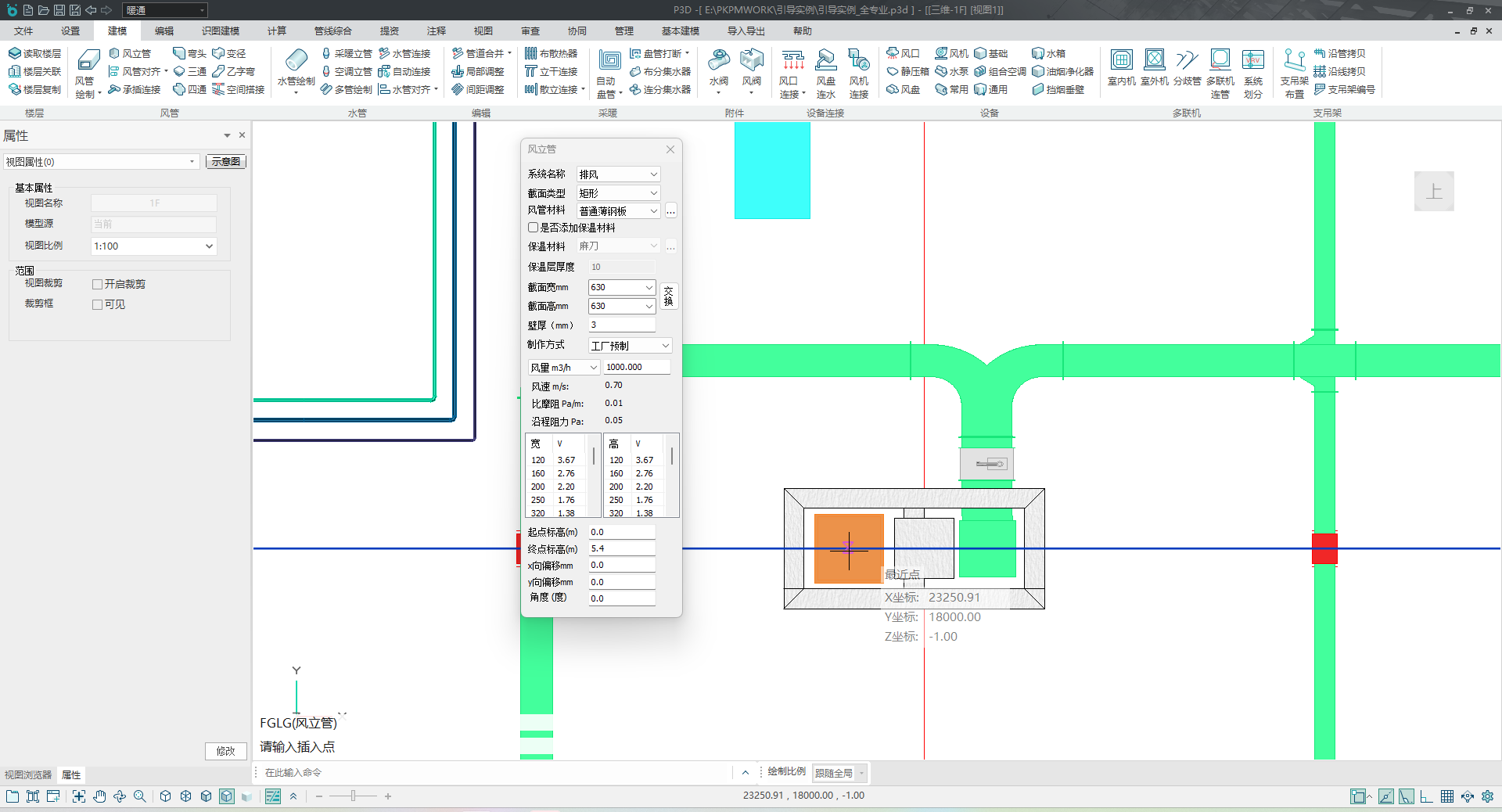 切换楼层1进行风系统的相关布置,点击风管工具栏–风立管,选择风管系统形式为排风系统,截面类型为矩形,截面尺寸宽和高设置为 630mm 和 630mm,然后调整起点、终点标高分别为0和5.4m,进行风立管绘制,鼠标左键确定完成,如图 3.2-1;
