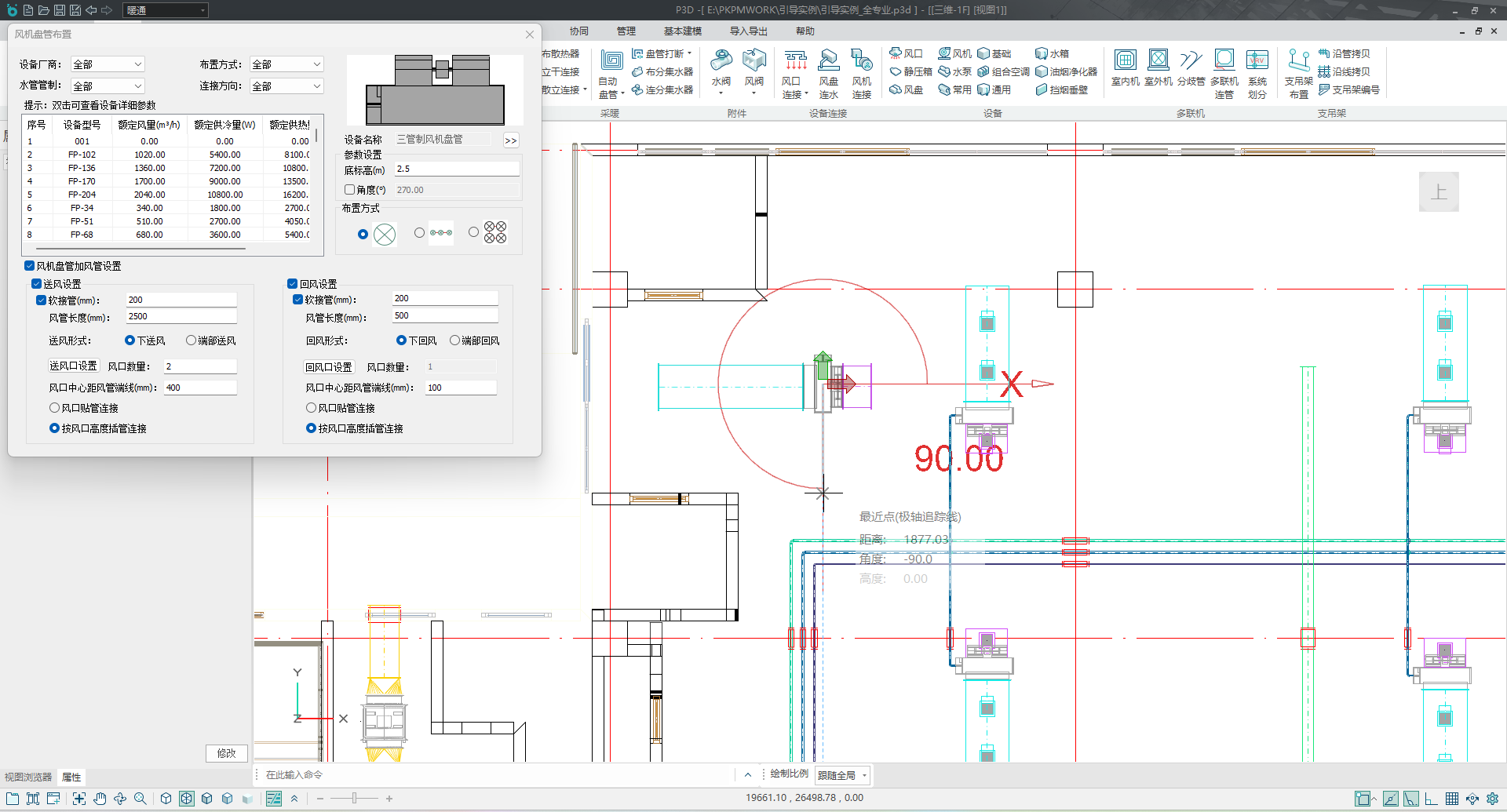 目录 搜索 展开 PKPM-BIM 项目应用案例教程第1章 建筑设计模块1.1 创建新项目1.1.1 创建新项目1.1.2 项目参数设置1.1.3 楼层设置1.1.4 放置轴网元素1.1.5 创建场地1.2 创建一层建筑主体1.2.1 创建柱1.2.2 创建墙1.2.3 创建楼板1.2.4 放置门窗1.2.4.1 普通门窗的设置1.2.4.2 常用设置集的配置1.2.4.3 自定义门窗设置1.2.4.4 放置门1.2.4.5 放置窗1.2.5 放置幕墙1.2.5.1 创建幕墙1.2.5.2 幕墙与墙体的剪切1.2.5.3 幕墙编辑1.2.6 创建房间、区域、楼梯1.2.6.1 创建房间1.2.6.2 创建防火分区1.2.6.3 创建楼梯1.3 创建二层建筑主体1.3.1 过滤选择1.3.2 局部复制1.3.3 二层构件修改1.3.3.1 墙体调整1.3.3.2 创建栏杆扶手1.3.3.3 放置门窗1.3.3.4 放置楼梯1.3.3.5 板上开洞1.3.3.6 创建房间和区域1.4创建三、四层建筑主体1.4.1 楼层复制1.4.2 楼板轮廓修改1.4.3 修改门窗1.5 创建屋顶层1.5.1 增强过滤器1.5.2 局部复制1.5.3 .同类构件的快速删除1.5.4 .墙体调整1.5.5 创建楼板1.5.6 创建门窗1.5.7 创建楼梯、栏杆1.5.8 创建房间和区域1.6 细部模型建立1.6.1 补充构件 1.6.1.1 增加台阶和坡道 1.6.1.2 增加栏杆扶手 1.6.1.3 增加雨棚 1.6.1.4 增加烟道 1.6.1.5 烟道洞口布置 1.6.2 放置素材1.6.2.1 素材库1.6.2.2 符号库1.6.2.3 参数化组件库1.7 清单1.8 智能审查1.9 出图1.9.1 出图流程介绍1.9.2 视图创建1.9.3 标注制图1.9.4 显示方案设置1.9.5 视图属性设置1.9.6 生成图纸1.9.7 成果导出第2章 结构设计模块2.1 新建项目 2.2 建立轴网 2.3 上部结构建模 2.4 楼层管理 2.5 计算分析前处理 2.6 计算结果查看 2.7 生成施工图 2.8 施工图审查第3章 暖通设计模块3.1 基本设置3.1.1 读取项目3.1.2 选择楼层3.1.3工程设置3.2 风系统建模3.2.1 风管绘制3.2.2 风口布置及连接3.3 空调水系统建模3.3.1 水管绘制3.3.2 风机盘管布置3.3.3 设备智能连接3.4 多联机系统3.4.1 室内外机布置3.4.2 多联机连管3.4.3 系统划分3.5 楼层复制3.6 材料统计3.6.1 材料统计3.6.2 材料结果查询3.7 模型审查3.7.1 全局属性3.7.2 条文审查3.7.3 调整模型3.8 暖通出图3.8.1 出图流程介绍3.8.2 视图映射创建3.8.3 标注制图3.8.4 显示方案设置3.8.5 视图属性设置3.8.6 生成图纸3.8.7 成果导出第4章 给排水设计模块4.1 设置4.1.1基本设置4.1.2系统设置4.2 给排水系统建模4.2.1 给排水管道绘制4.2.2 卫浴设备布置4.2.3 智能连接4.3 消火栓系统建模4.3.1 消火栓管绘制4.3.2 消火栓灭火器布置及连接4.4 喷淋系统建模4.4.1 喷头布置4.4.2 喷头连接4.4.3 识图建模4.5楼层复制4.6 材料统计4.6.1 材料统计4.6.2 材料结果查询4.7模型审查4.7.1 全局属性 4.7.2 条文审查4.7.3 调整模型4.8给排水出图4.8.1出图流程介绍4.8.2视图映射创建4.8.3标注制图4.8.4显示方案设置4.8.5视图属性设置4.8.6生成图纸4.8.7成果导出第5章 电气设计模块5.1 基本设置5.1.1 基本设置5.1.2 工程设置5.2 配电系统布置 5.2.1 配电柜布置5.2.2配电室桥架布置5.2.3配电室电缆沟布置5.2.4配电室变压器布置5.2.5配电箱布置5.3 照明系统布置5.3.1正常照明点位布置5.3.2应急照明照明点位布置5.4 火灾自动报警系统布置5.4.1 温感烟感点位布置5.4.2 消防广播点位布置5.4.3手报、声光报警器、消火栓启泵按钮、消防电话点位布置5.4.4消防端子箱布置5.5 弱电安防系统布置5.5.1监控摄像头点位布置5.5.2弱电插座点位布置5.5.3弱电机柜点位布置5.5.4识图建模5.6 平面布线5.6.1 设备连接5.6.2线管避让5.7楼层复制5.7.1 楼层复制5.8 材料统计5.8.1 材料统计5.8.2 材料结果查询5.9模型审查5.9.1 智能审查规则5.9.2 审查流程第6章 协同设计模块6.1 碰撞检查6.2 开洞提资6.2.1 生成开洞提资条件6.2.2 实际洞口处理生成6.3 净高分析6.3.1 净高设置6.3.2 净高平面6.3.3 净高检查6.4 模型链接6.5 合并工程 暂无相关搜索结果! 3.3.2 风机盘管布置 操作步骤:1) 布置风机盘管选择设备功能栏中的风机盘管,选卧式暗装风机盘管,并点击附加,勾选送风管和回风箱,布置形式选择任意布置,如勾选角度可直接点击左键布置风盘,不勾选角度则左键确定风盘放置位置,移动鼠标调整风盘方向,再次点击左键完成风盘布置,如图3.3-3; 图 3.3-3 风机盘管布置3) 通过复制、镜像等方式完成全部房间布置;点击编辑选项卡,在通用工具栏利用复制或镜像等功能,完成多个风机盘管布置,如图3.3-4; 图 3.3-4 复制与镜像应用